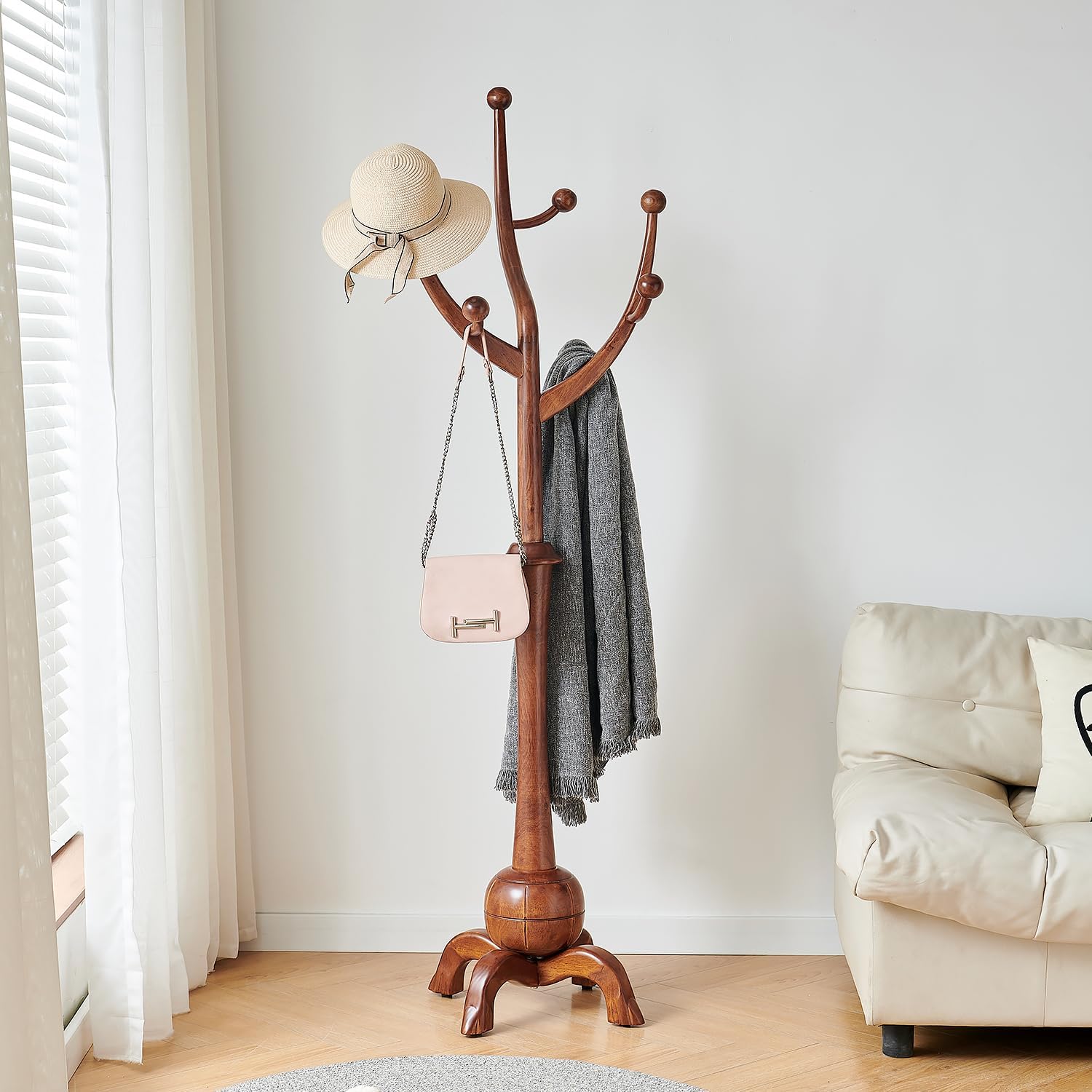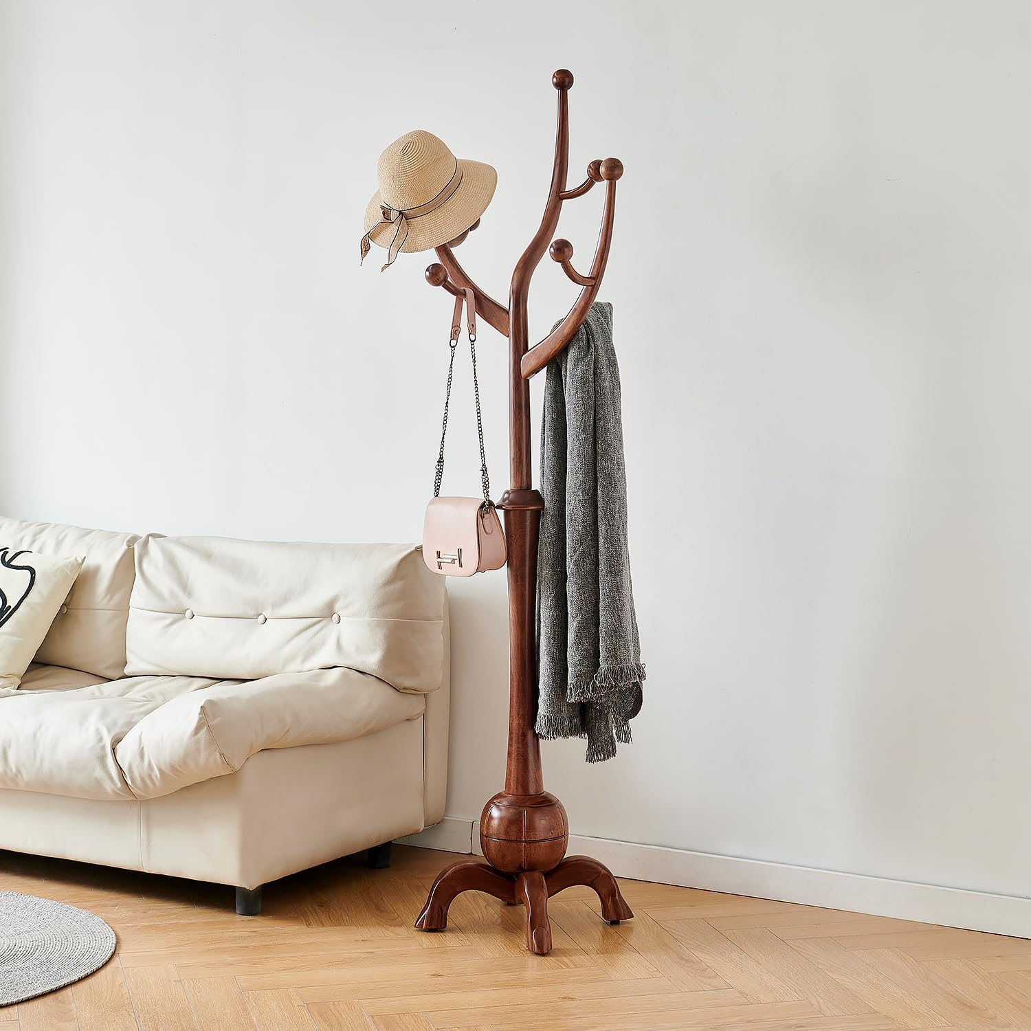 Entryway Wood Coat Rack Stand with Tree Branch Hooks, Freestanding Wooden Hat Coat Tree