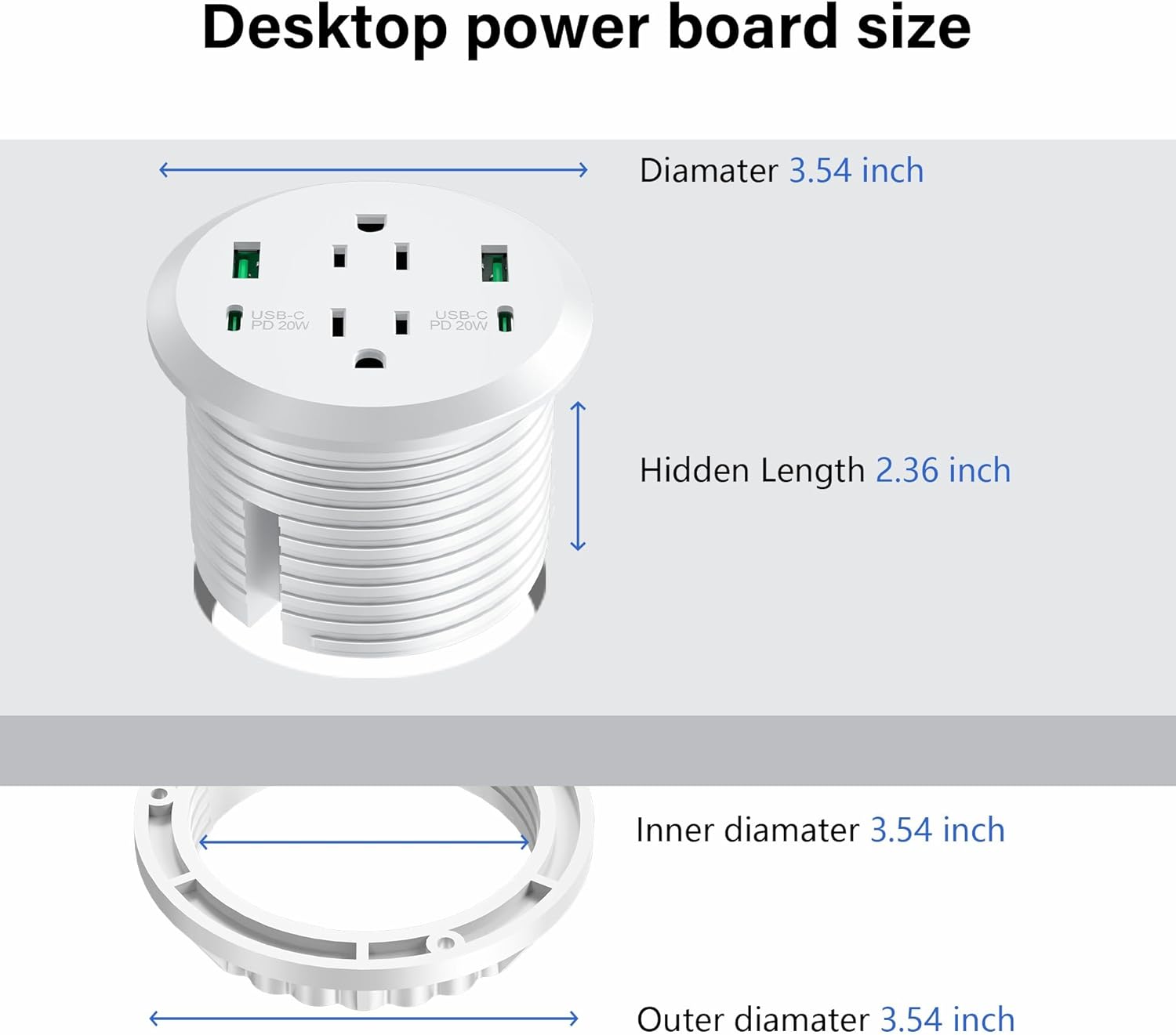 - Streamline Your Workspace: Experience the sleek, minimalist design of our surface mount recessed power grommet. Say goodbye to bulky adapters with this 3-inch desk hole grommet, featuring 2 power outlets and 4 USB ports perched atop your desktop outlet for a nearly flush, clutter-free surface.