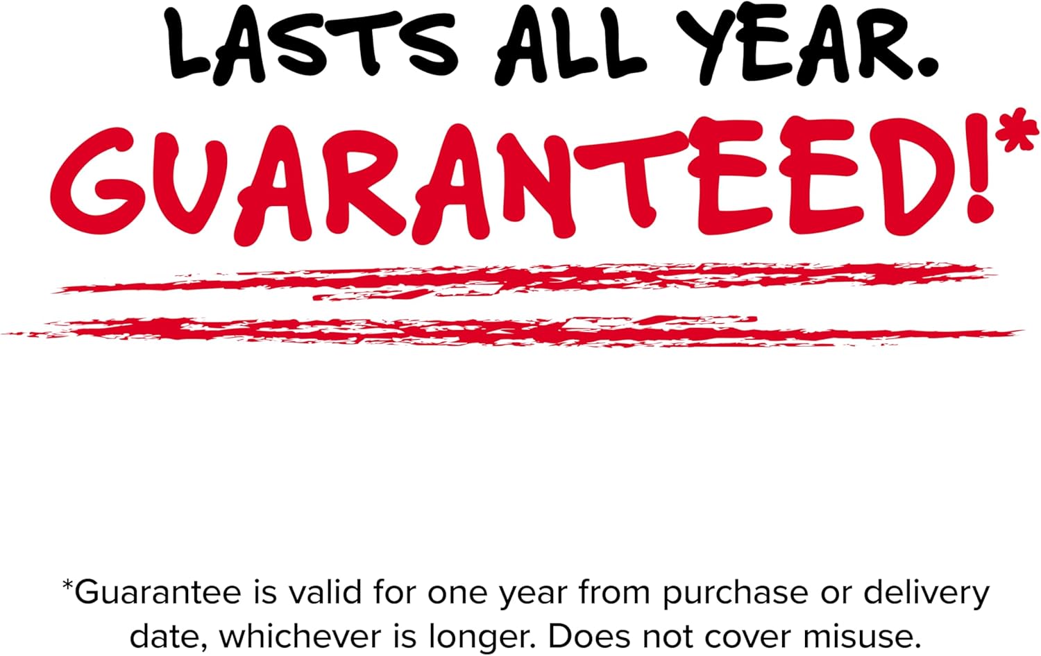 - LASTS ALL YEAR. GUARANTEED! Guarantee is valid for one year from purchase or delivery date, whichever is longer. Does not cover misuse.