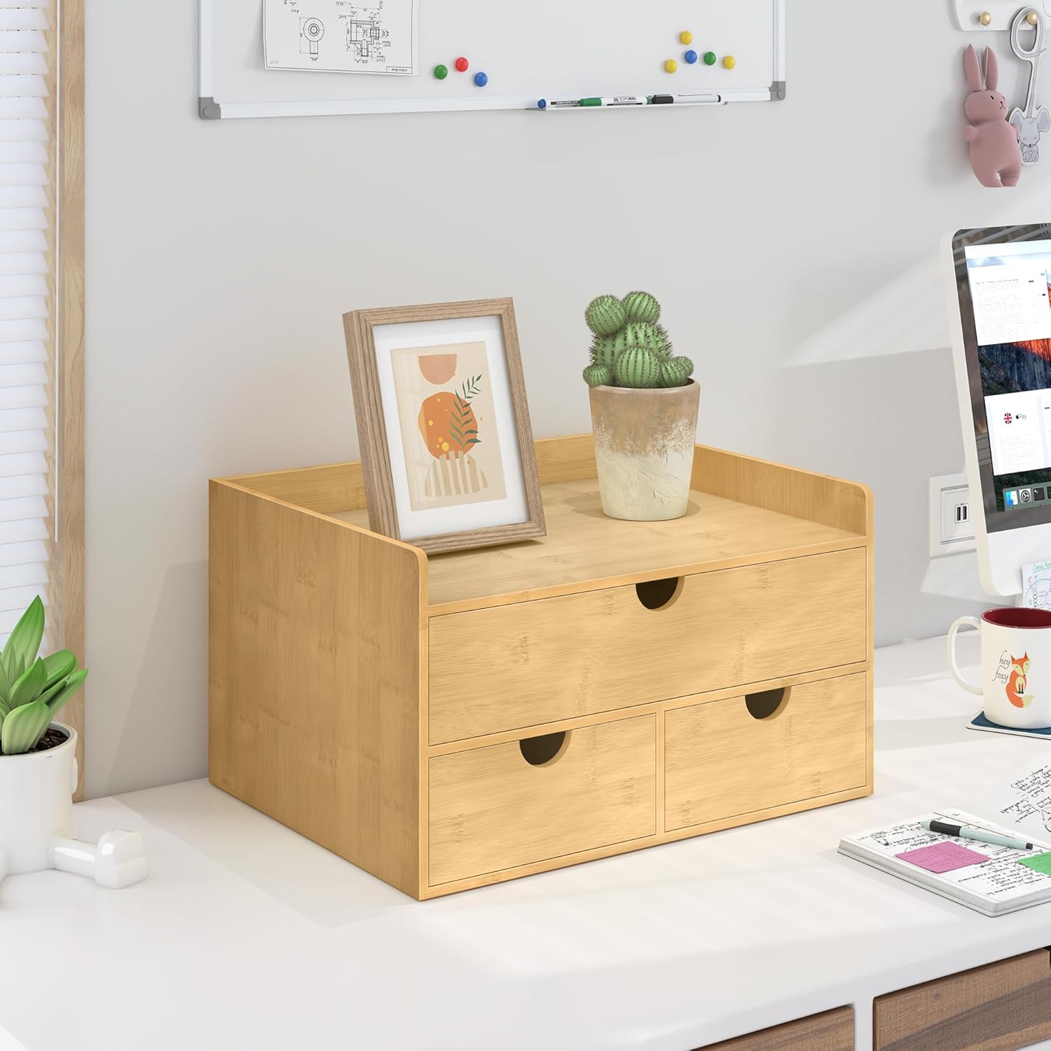 Bamboo Desk Drawer Organizer, Large Desktop Organizer with Drawers Tabletop Storage Organization Box for Office Home Toiletries Supplies Vanity, No Assembly Required (3 Drawer with Shelf)