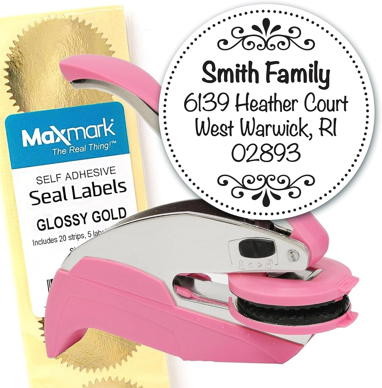 Custom Monogram Address Pink Embosser - Personalized Round Seal with 50 Gold Seal Labels - Style EM027