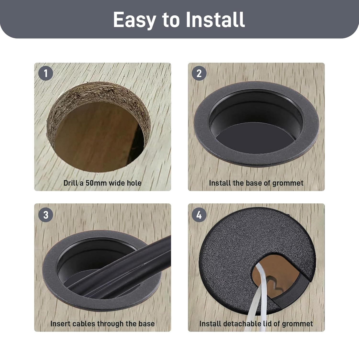 - 【Easy to Install and Use】Fits desk hole 2 inches/50mm. Remove the lid first, place the main part of the desk hole cover directly into the hole after drilling to add the wires and cables, and then close the lid.