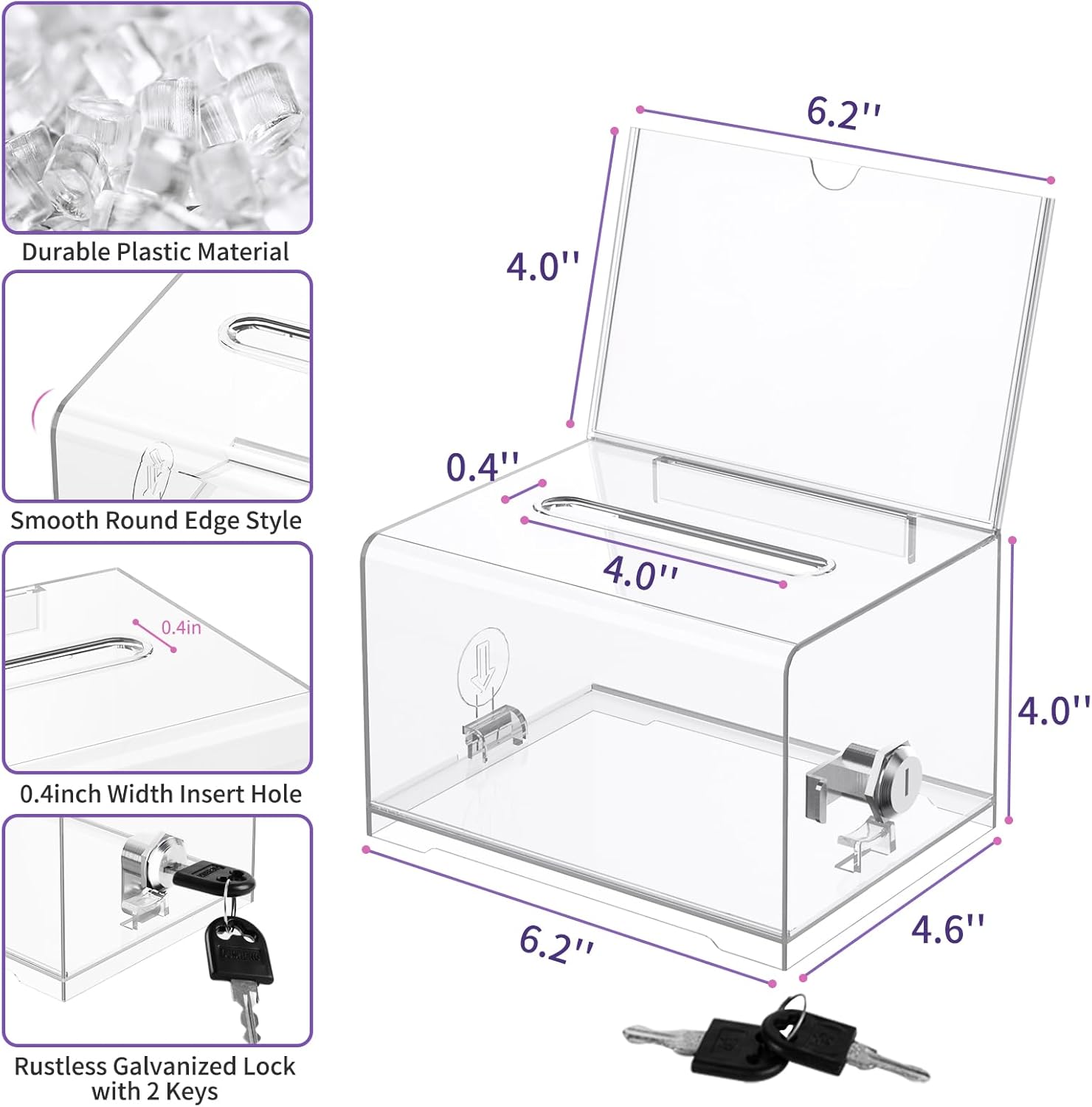 - Portable and lightweight: 6.2inch*4.6inch*4.0inch, 0.84lb. Smooth round edge style, 0.4inch width insert hole. Ballot box is light in weight, small in size, easy to carry and store, suitable for various occasions and activities, such as schools, churches, charities, shops, etc.