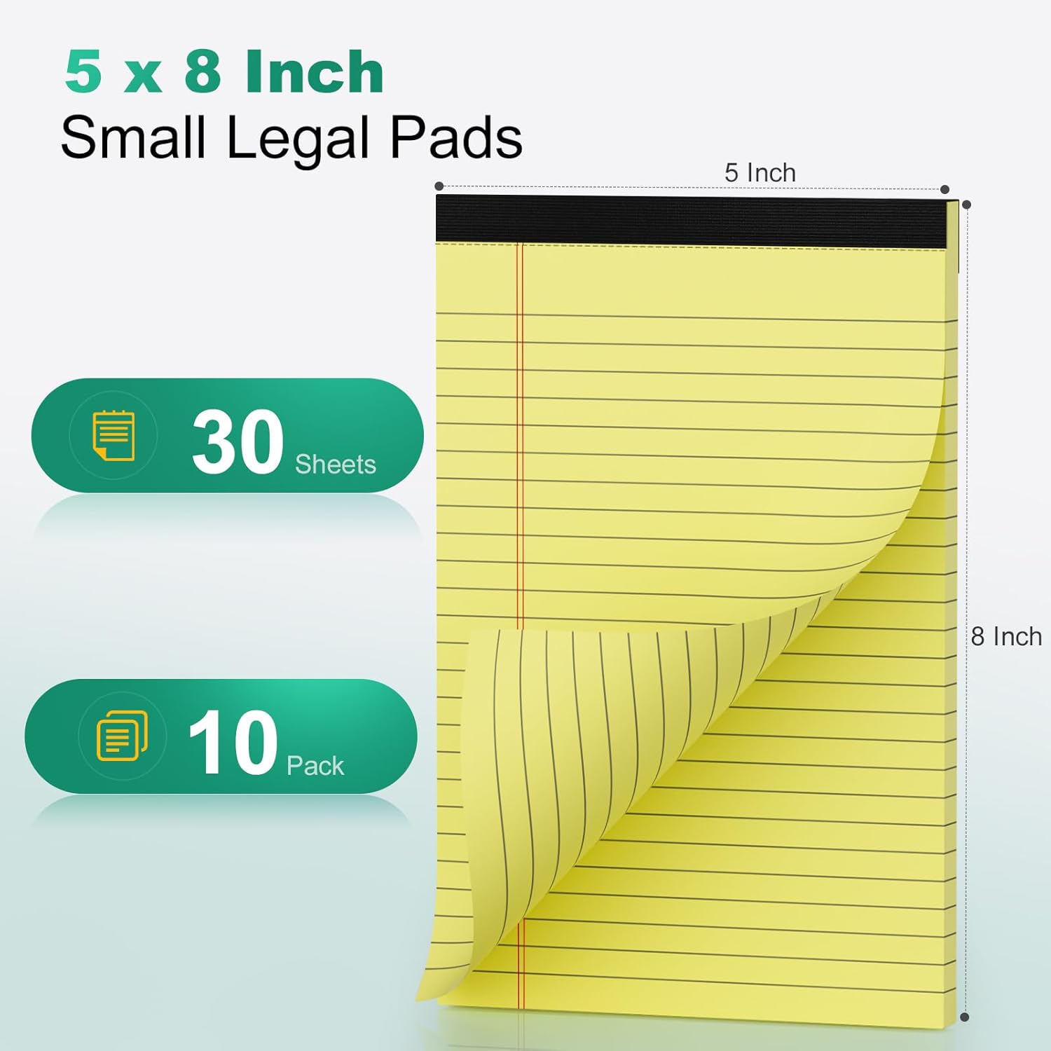 - 【Size & Quantity】5x8 legal pads are compact and efficient, narrow ruled 9/32" (7mm) line spacing,easy to write on each sheet, fits in backpacks and handbags,easy to carry around. 10 pack of 30 sheets yellow legal pads, with a total of 300 sheets to meet your daily usage and replacement, without worrying about running out of paper. These small legal pads perfect for writing notes, letters, thoughts and lists.