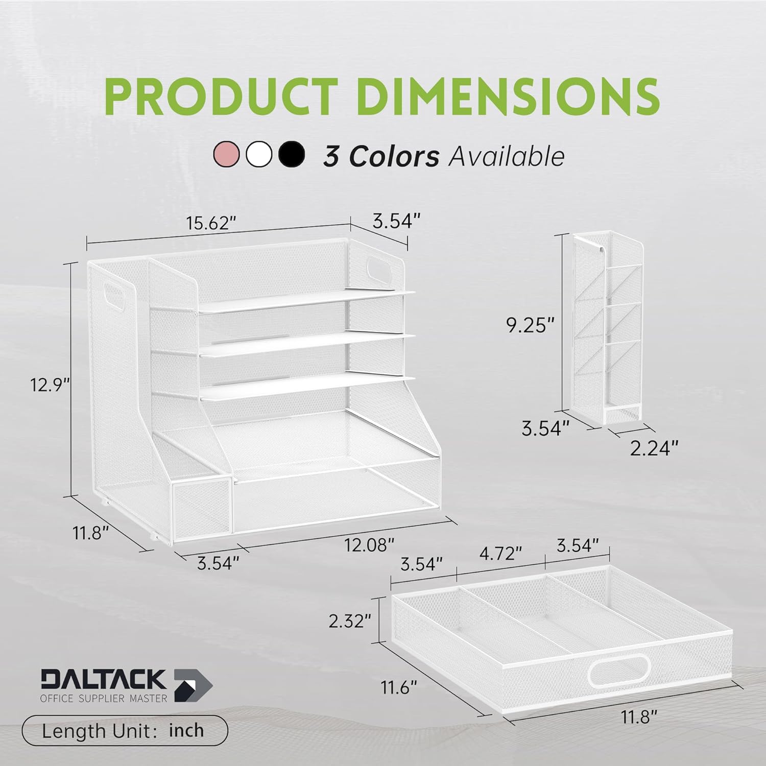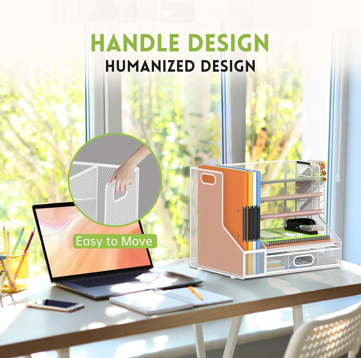 DALTACK Mesh Desk Organizer, 5-Tier Paper Letter Tray with File Holder & Pen Holder & Sliding Drawer, Desktop Organizer and Storage for Desk Accessories Office Supplies, White