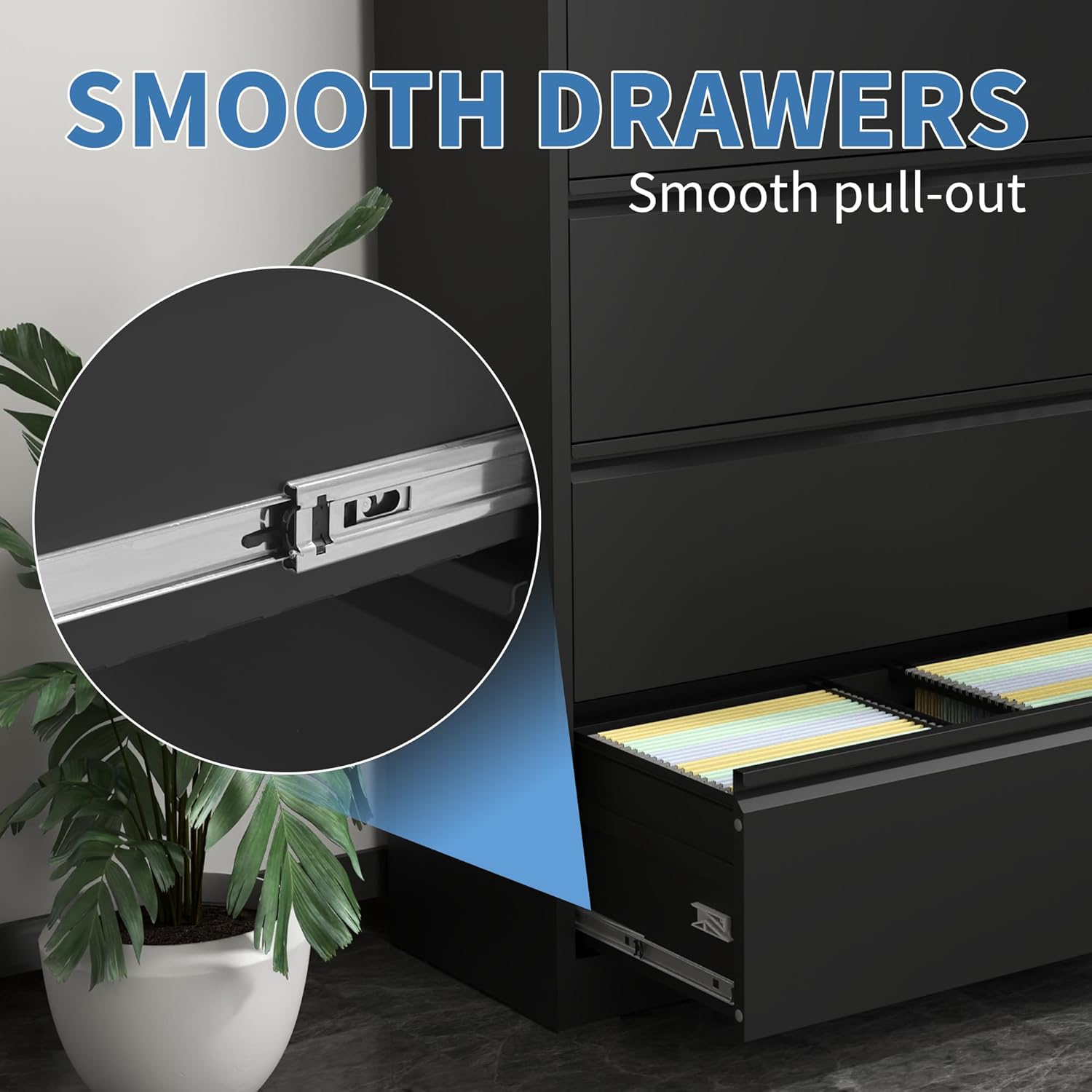 - ăSturdy and Functională The 5 drawer file cabinet size:D15.75"*W35.43"*H64.09", drawer size:D13.98"*W32.44"*H9.8", each drawer can support up to 55 lbs. The lateral file cabinet is equipped with premium full-extension metal drawer slides, allowing for smooth and easy access even when fully loaded, making organization a breeze.