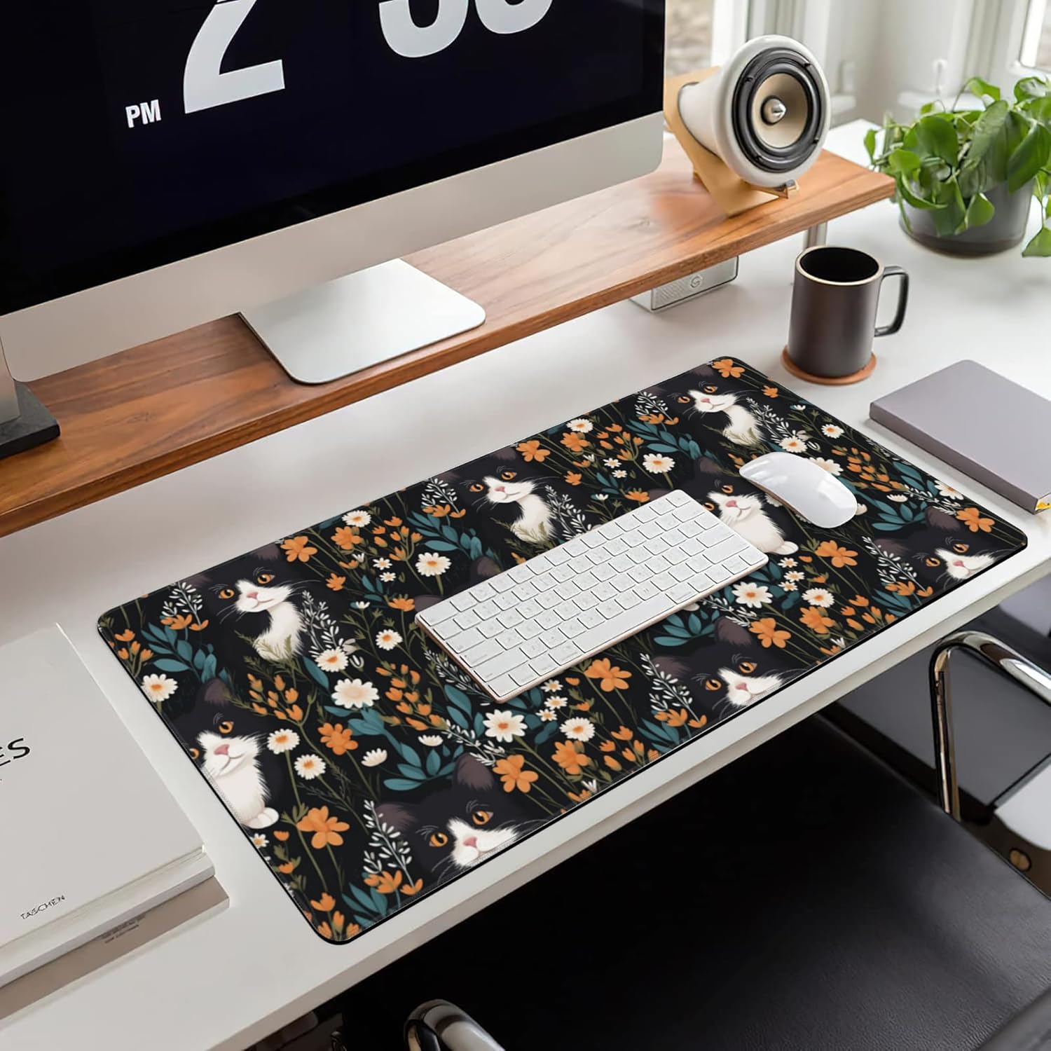 Extended Large Gaming Mouse Pad, Black Cat Wildflowers Large Desk Mat for Desktop XXL, Non-Slip Rubber Base Stitched Edges Long Computer Keyboard Desk Pad Mouse Mat for Gaming Home Office 35.4"X15.7"
