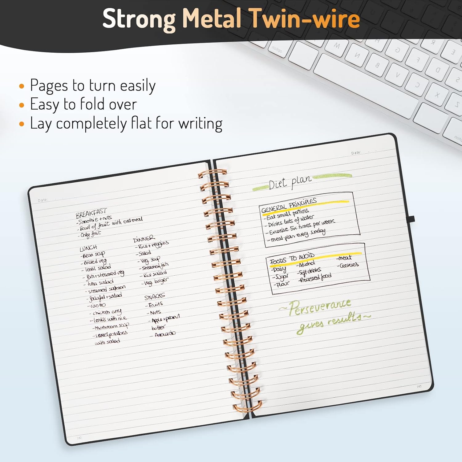 - Strong Metal Twin-wire: Feature a super durable Golden double wire spiral binding with heavy-duty hardcover; making it easy to fold over and laying the notebook totally flat easily, giving you a better writing experience. The Professional durable hardcover will protect your journal to last for years. Product Dimensions: 11 in (L), 8.5 in (W), 1.0 in (H).