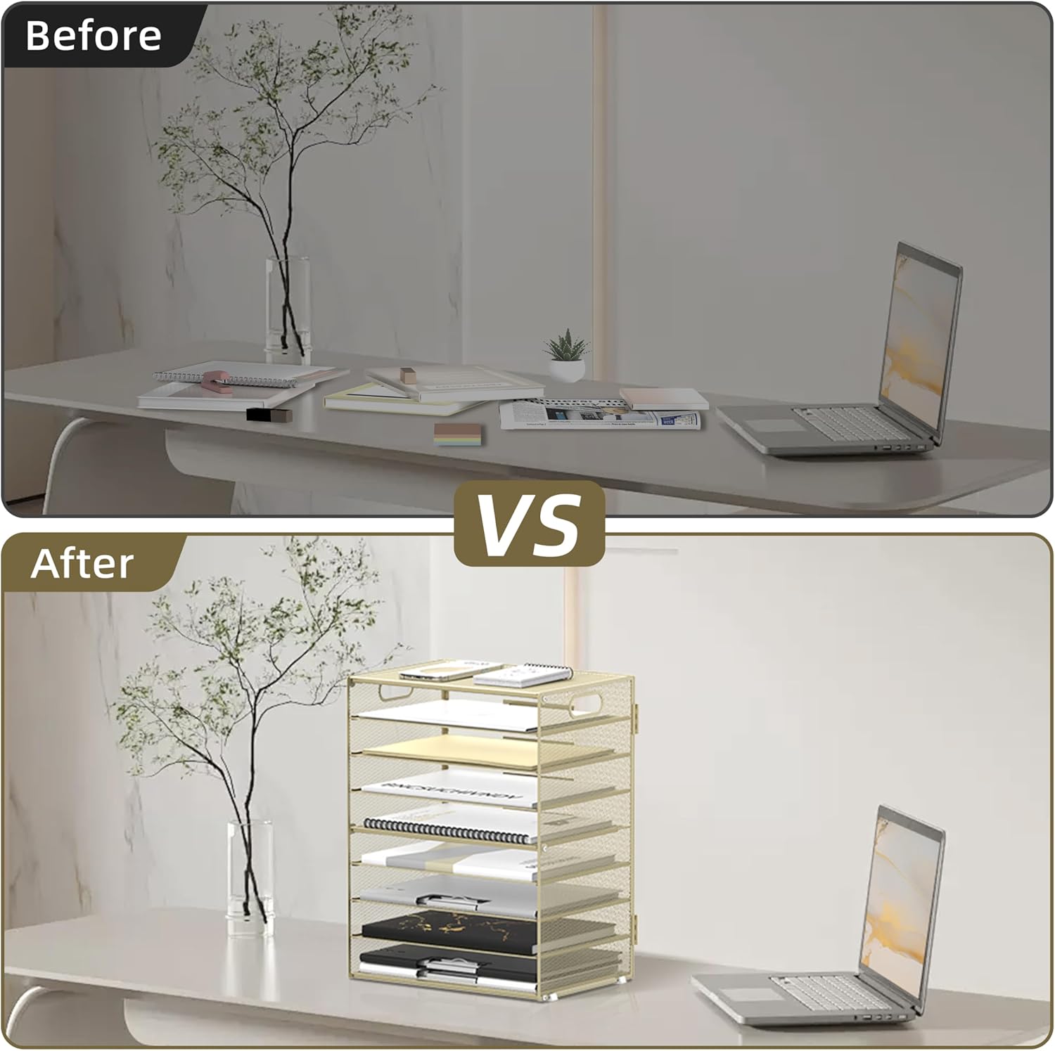 - [Perfect Paper Organizer] The 9-tier paper tray desk organizer has a large capacity for all your office supplies and accessories, such as: letters, paper, printing paper, books, folders, bills, magazines and so on. Keep your desk away from clutter and increase your productivity.