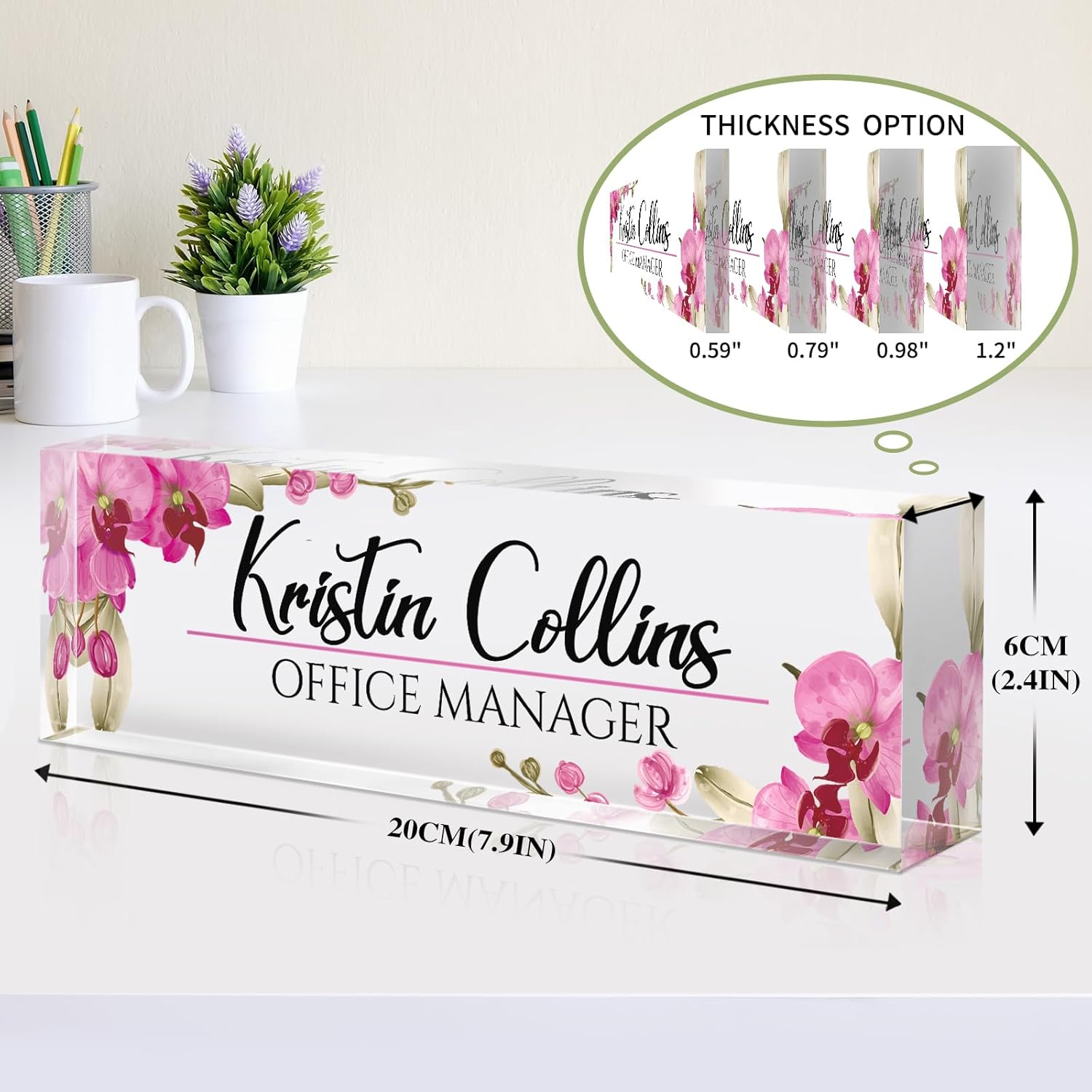 - π Premium Quality: Crafted from premium acrylic, the personalized desk nameplates are built to last. With exceptional durability and clarity, they're ten times stronger than glass. And thanks to the special UV printing technique, the colors stay vibrant and the text stays sharp, no matter how much time goes by.