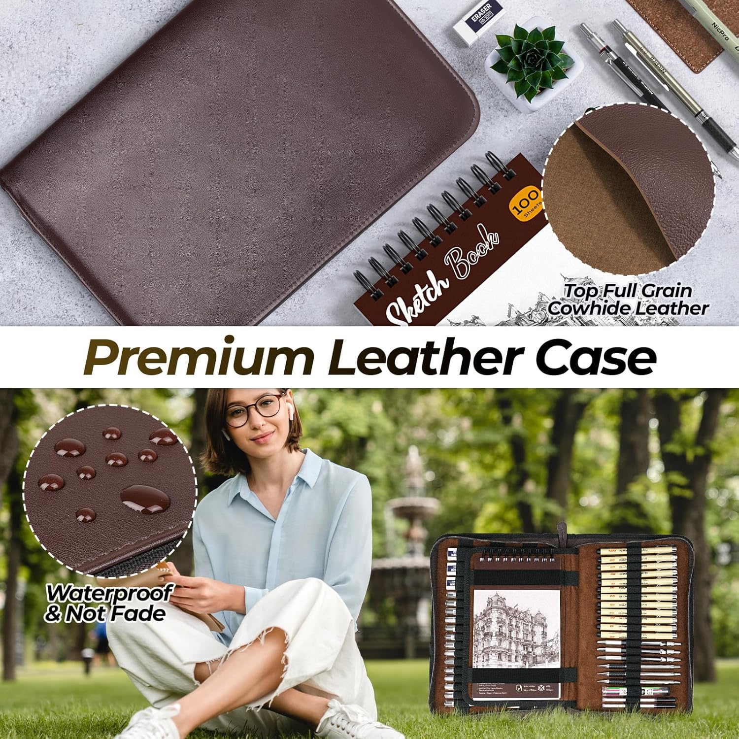 - Portable Leather Pencil Case and Perfect Gift: All sketching supplies in a premium top grain leather case, the interior of the leather pouch is made from velvet lining, soft feeling yet tough with a wonderful leather aroma. When you take this art set out to sketch, not only is it easy to carry around, but also provides perfect protection for your drawing tools! In addition, beautifully packaged in a gift box is the best gift for advanced artist, adults, teenagers, beginners, kids, art students, hobbyists on Christmas, Thanksgiving, Birthday, Graduation and Easter Day
