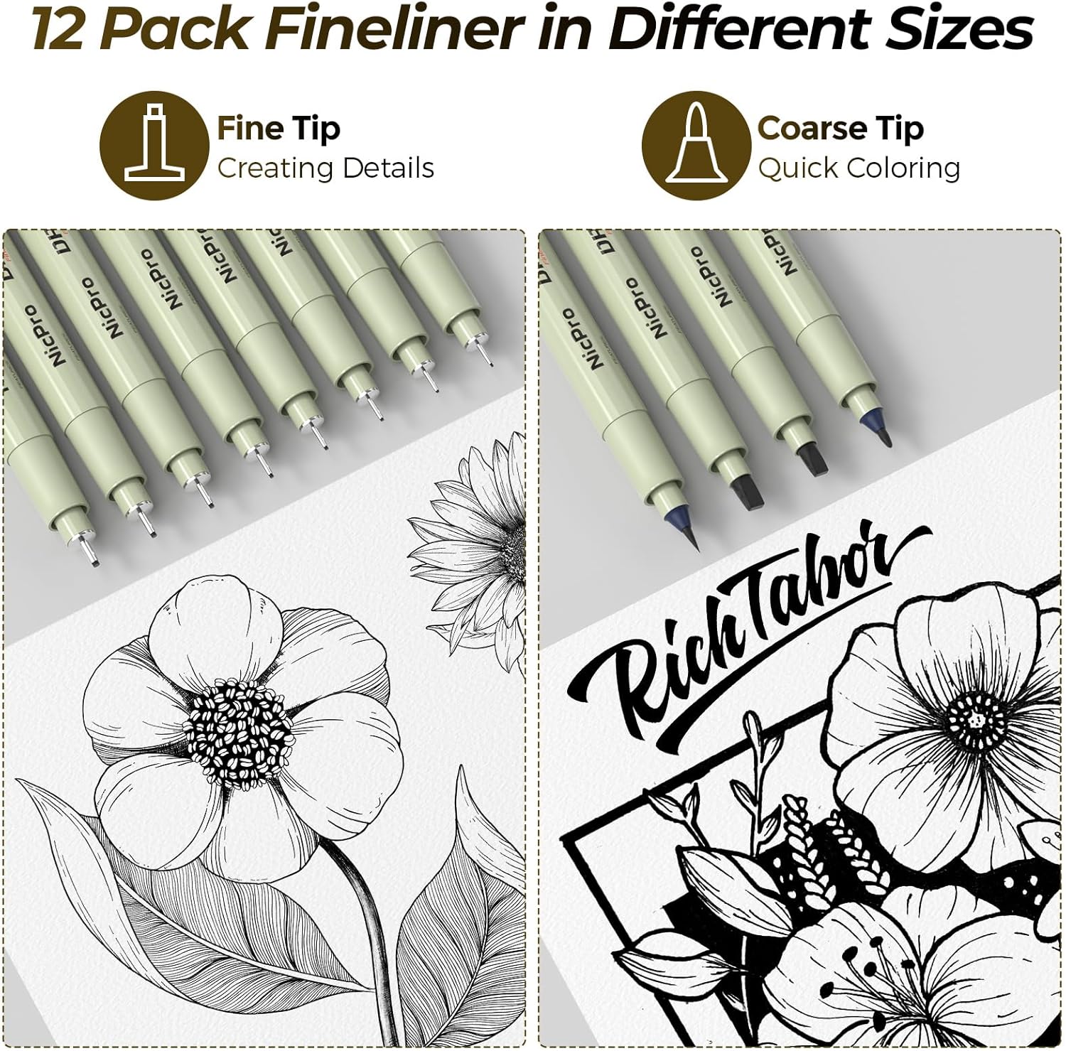 - 12 Black Micron Drawing Pens: The drawing pen set contains 12pcs assorted types of micron pens, Line width & cap size: 0.2mm (005), 0.25mm (01), 0.3mm (02), 0.35mm (03), 0.40mm (04), 0.45mm (05), 0.50mm (08), 0.55mm (1.0), 1.0mm (1), 2.0mm (2), 3.0mm (3), Brush (BR). No Bleed, No Smear and Waterproof. Perfect for artists and designers drawing, writing. Whether you are an artist or a beginner, you can easily use it