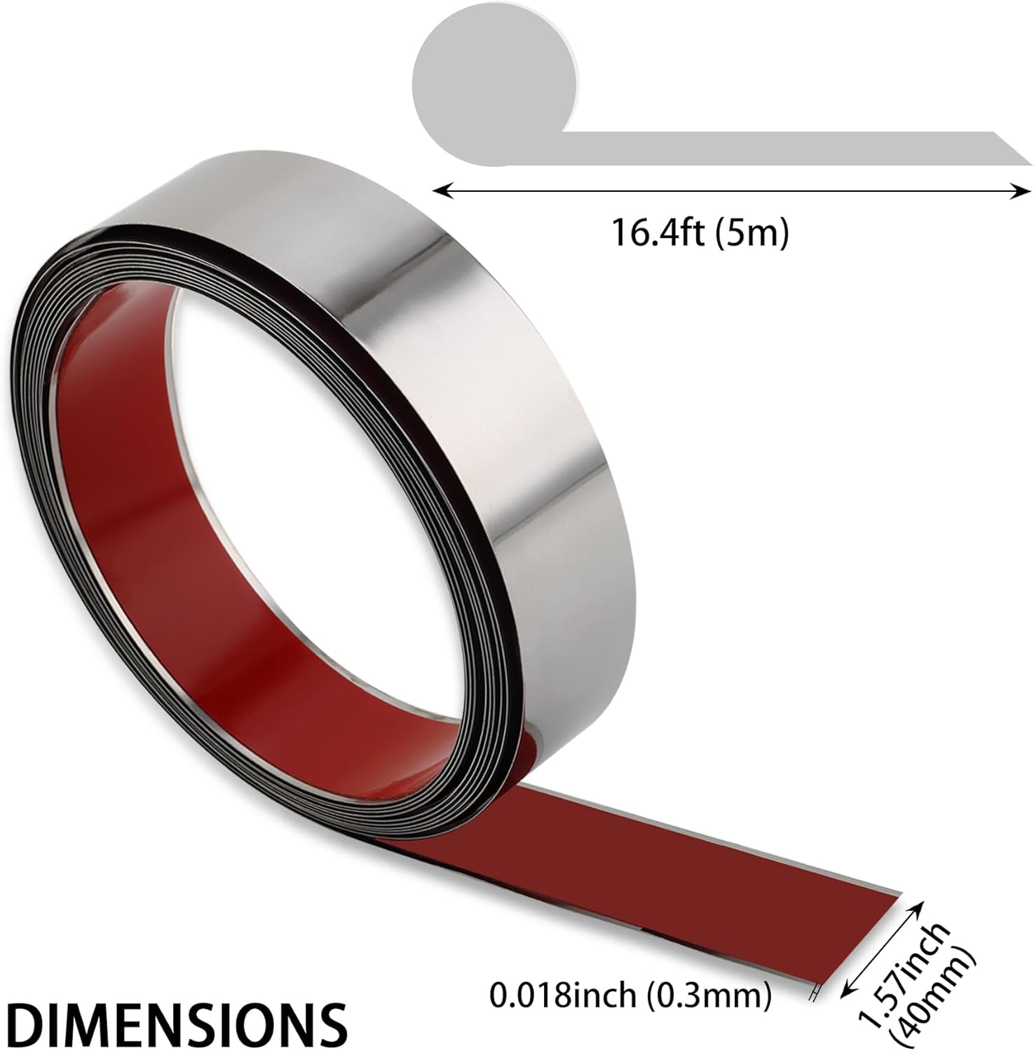 Flexible Self Adhesive Metal Strip for Magnet, Strong Peel and Stick Ferrous Tape Roll for Workshop, Office, School and Home Decoration (Shiny Silver, 16.4ft x 1.6inch)