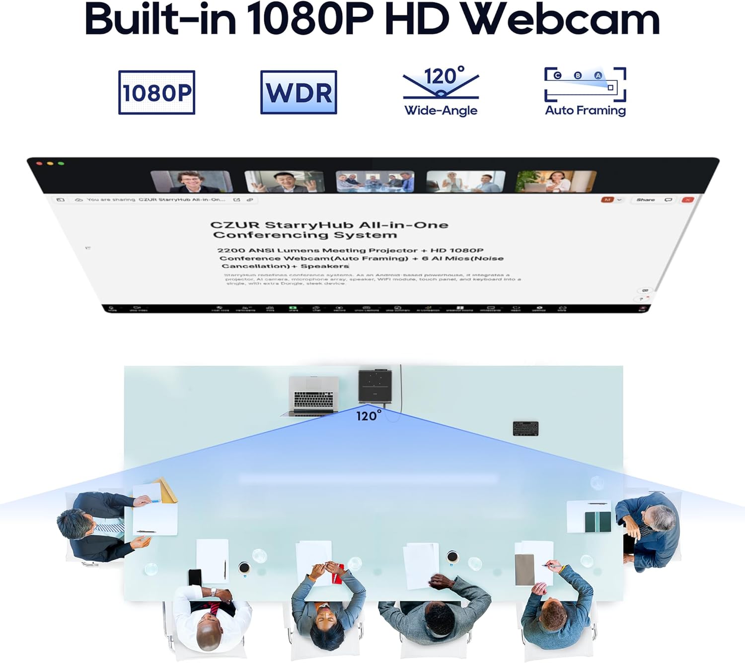 - All-in-One Video Conferencing System: StarryHub integrates all the essential devices for a hybrid/local/video conference. It features a Short Throw Projector(2200 ANSI Lumens, 30-150’’ Display ) + a Conference Room Webcam(HD 1080P, 120° Wide Range, WDR, Auto Framing) + 6 Microphones(AI Driven Speakers’ Voice Enhancement) sound pick-up range up to 25 ft (8 meters) and built-in Conference Speakers