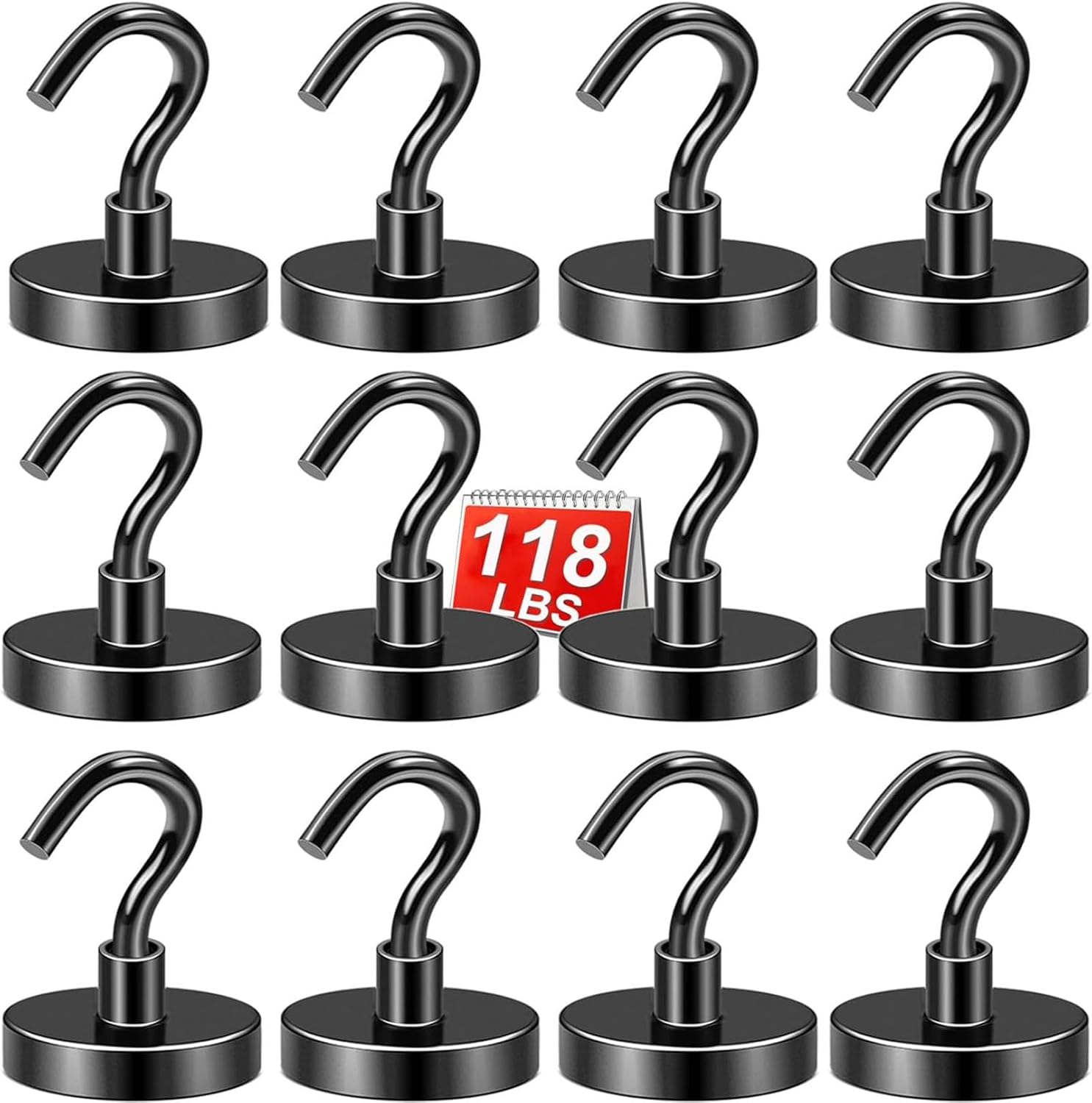 DIYMAG Black Magnetic Hooks, 118 LB Heavy Duty Strong Magnets with Hook, Rare Earth Neodymium Magnet for Cruise Cabins Ship Essentials 12 Packs