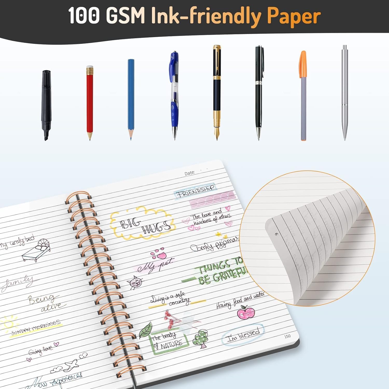 - 100 GSM Ink-friendly Paper: The pages are very thick which avoids ink bleeding through and ghosting. Suitable for most pen types, such as ballpoint pens, fountain pens, gel pens, pencils and so on. Allowing you to write on both sides of every page to maximize your usable space.
