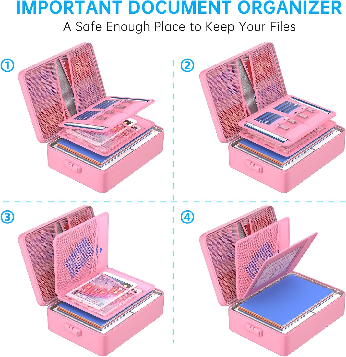ENGPOW 5200°F Fireproof Document Bag with Lock, Upgraded Heat Insulated Fireproof&Waterproof Box 8 Layers Document Organizer, Portable Home Travel Safe Storage Box for Important Files, Laptop, Pink