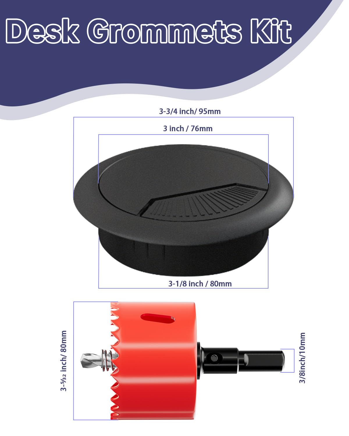 Desk Grommet 3-1/8 inch (80mm) - 8 Pack Black Cable Grommet & Desk Hole Cover with Hole Saw for Cables, Cord Management for Office, TV, and Home Table