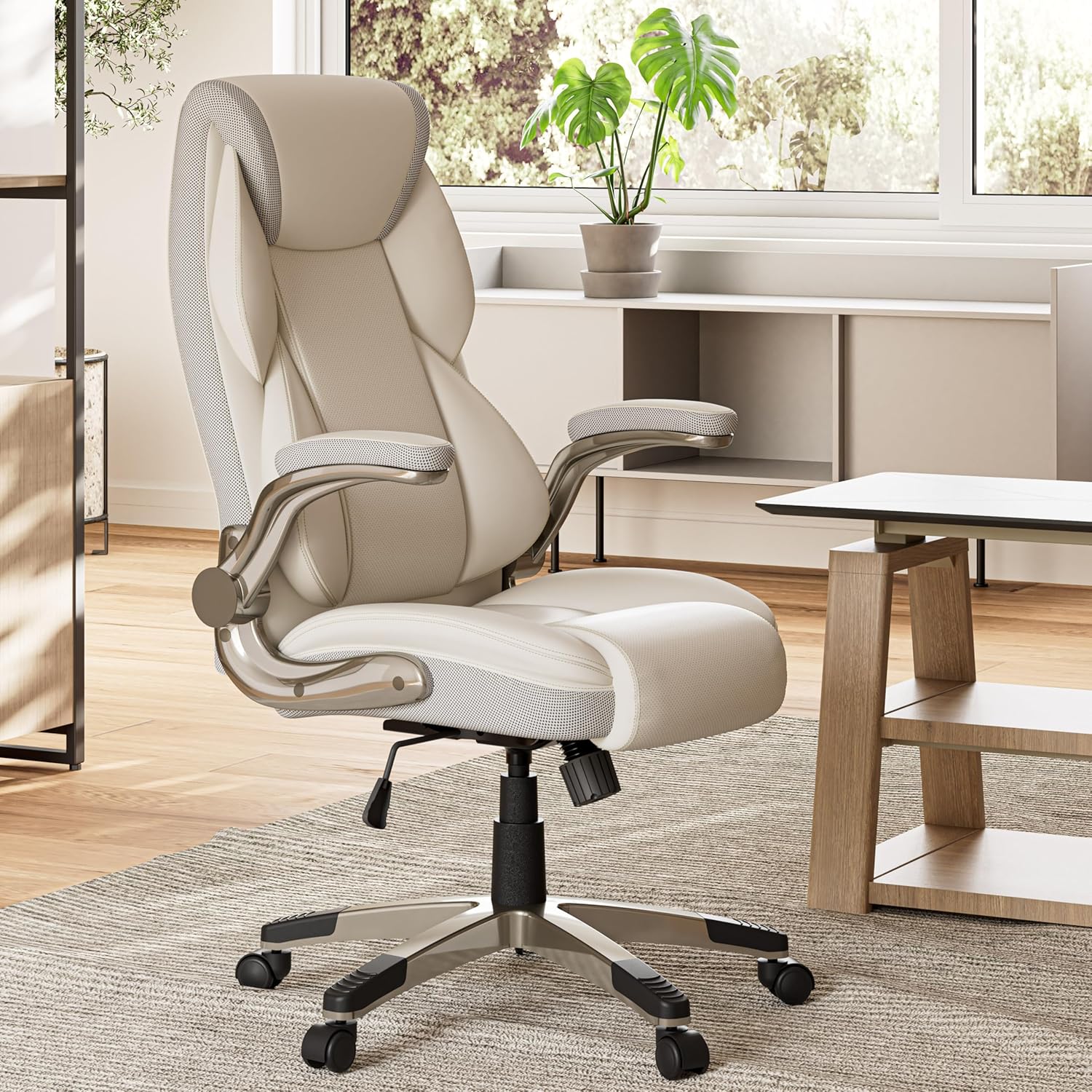 - 【Durable and Solid Construction】If you're looking for a high back executive office chair, beige ergonomic office chair or leather executive office chair, you've come to the right place. Our office chair flip up arm feature durable metal bases, class-4 gas cylinder, and top-quality rubber chair wheels that ensure a quiet, effortless glide that won't leave any marks on the floor. The 275-pound weight capacity is ideal for taller people, and the wide seat makes getting in and out easy.