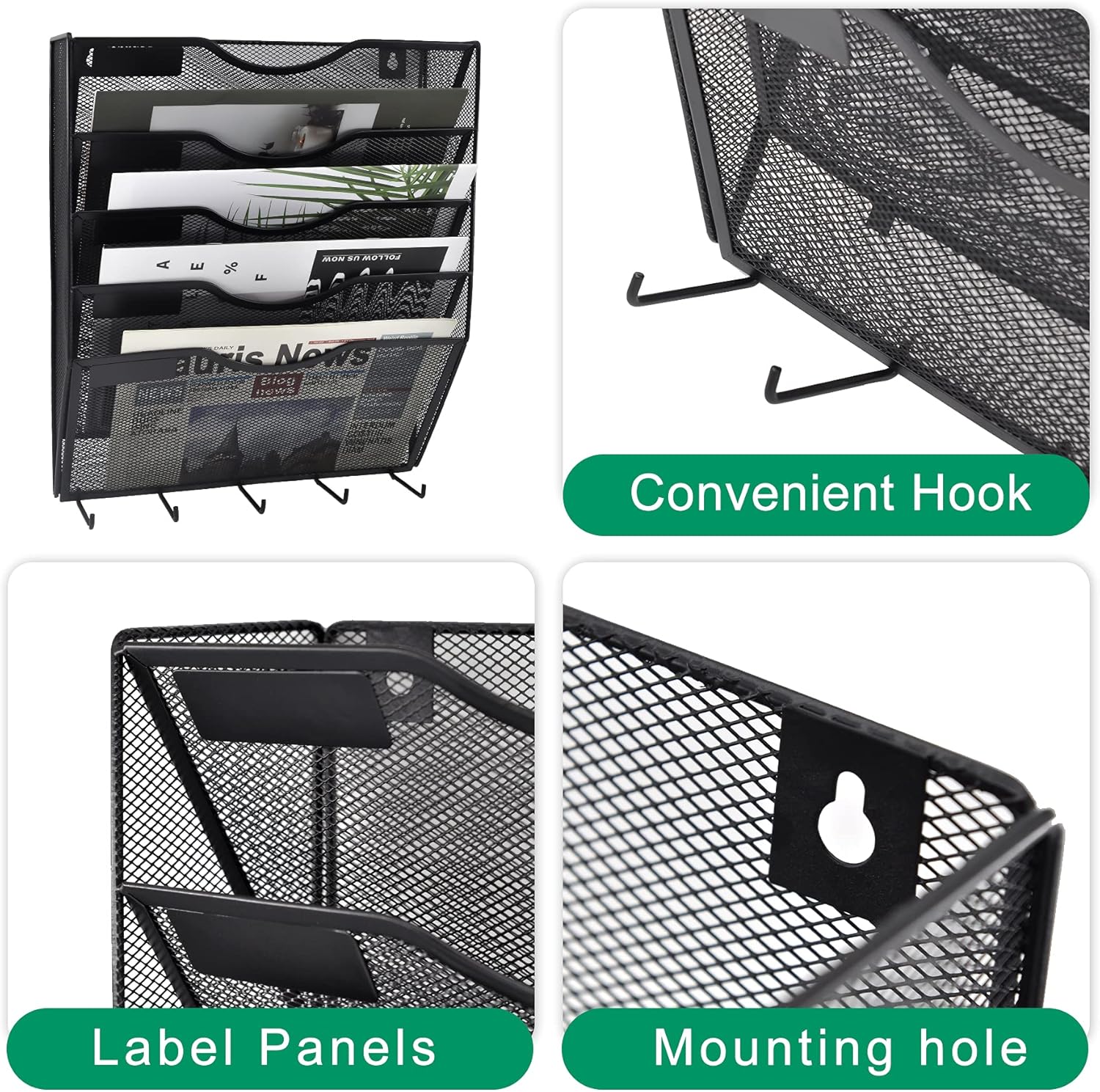 EASEPRES 5 Pocket Mesh Hanging File Organizer with Key Holder Hooks & Nametag Label, Wall Mounted Mail Paper Document Folder Storage Organization Magazine Rack for Office Cubicle, 5 Tier Black