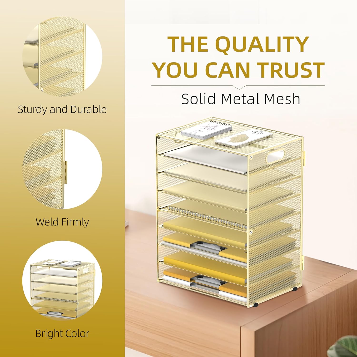 - [Strong and Sturdy] Our paper organizer for desk is made of solid metal mesh, soldering is very strong and sturdy, together with rubber non-slip pads to prevent sliding, avoid surface scratches. It is a sturdy file organizer.