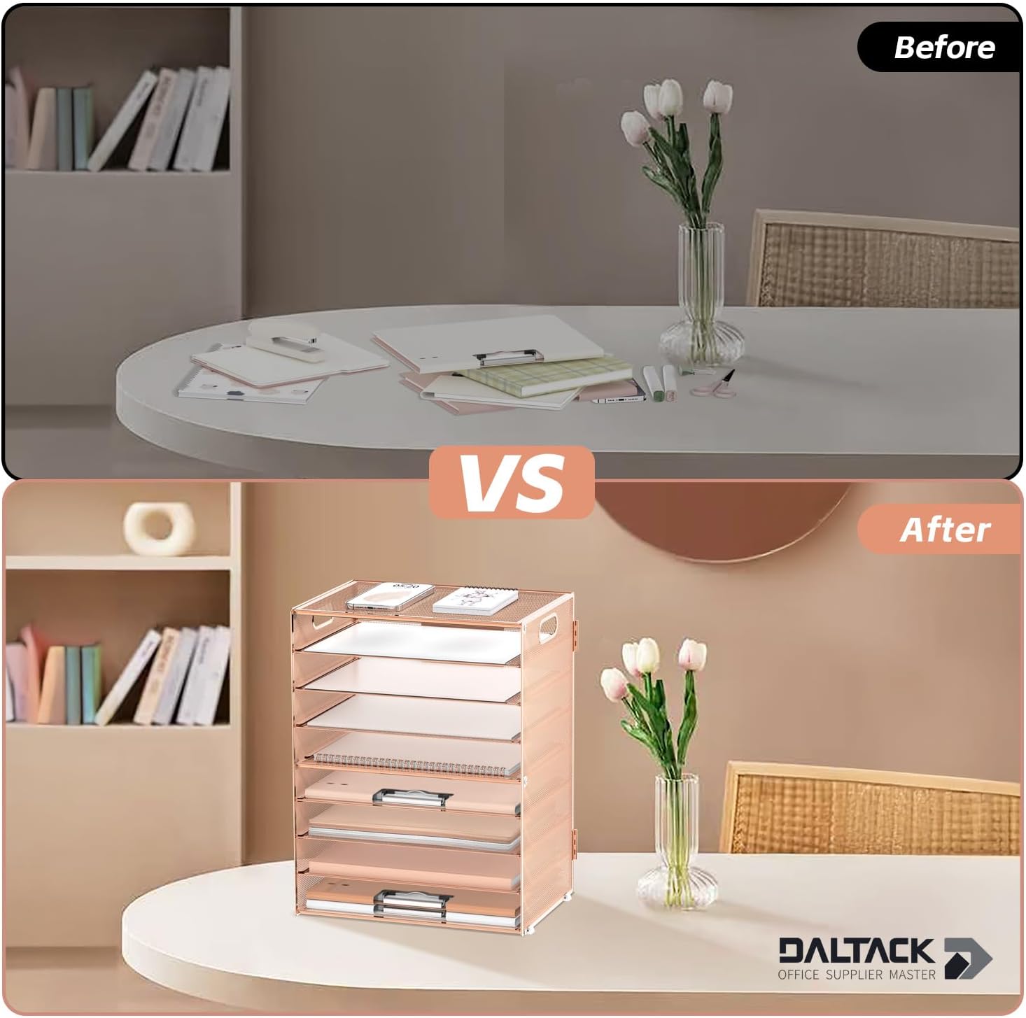 - [Perfect Paper Organizer] The 9-tier paper tray desk organizer has a large capacity for all your office supplies and accessories, such as: letters, paper, printing paper, books, folders, bills, magazines and so on. Keep your desk away from clutter and increase your productivity.