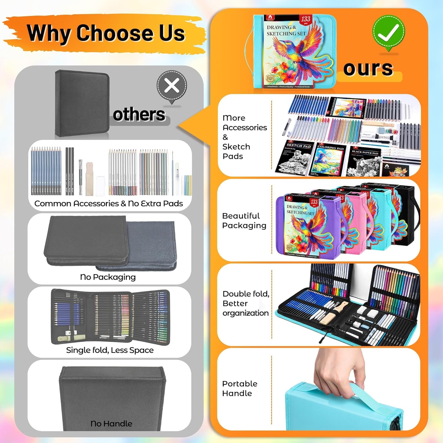 - 133 PCS Professional Drawing Kit Sketching Supplies: All you need are in this portable art case whether you are a professional or a beginner. It includes all the art supplies, specially added sketchbook, coloring book, watercolor pad and black paper pad. Perfect for drawing, sketching, shading, blending, layering and adult coloring books.With our professional drawing supplies kits, let your imagination flow and bring your ideas to your artistic journey