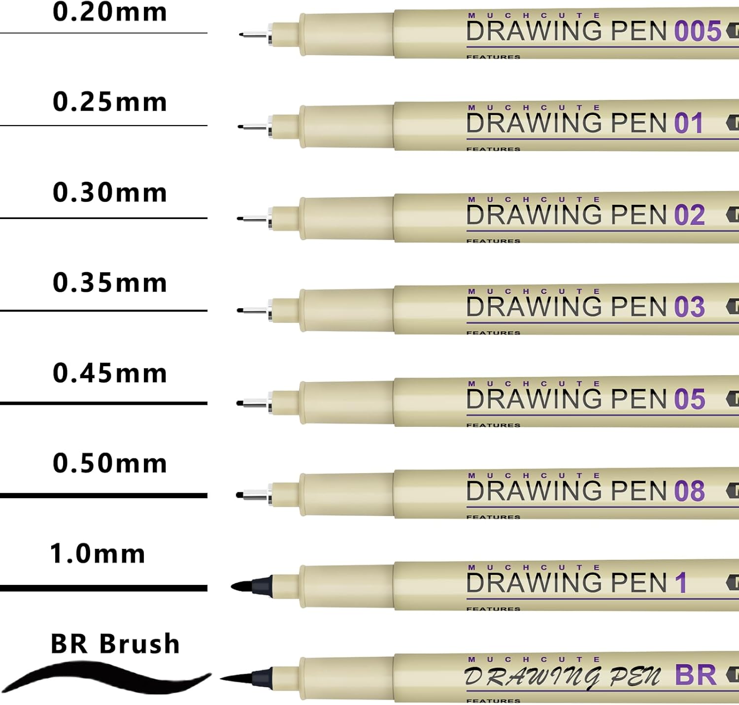 - ❤Muchcute 20 Micro Fineliner Art Drawing Set : The professional micro pen kit contains assorted types of pen tips from 0.2mm to 3.0mm, plus a brush tip. No Bleed, No Smear and Waterproof. Perfect for drawing and writing. One set of pens for all your art creation needs. Whether you are an artist or a beginner, you can easily use it. 12 Colors 0.25mm(01) & 8 Black Line Width & Cap Size: 0.2mm (005), 0.25mm (01), 0.35mm (03), 0.45mm (05), 0.50mm (08), 0.55mm (1.0), 1.0mm (1), Brush (BR)