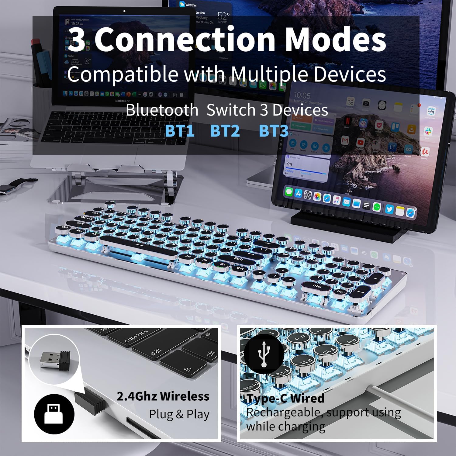 - Retro Typewriter Style Round Keycaps: TK950 wireless typewriter keyboard uses double-shot injection retro punk round keycap with clear backlight, extremely durable. Stepped floating keycaps that fit your fingertips perfectly, precise position. Ergonomic foot support makes typing less tiring and more comfortable. Highly-durable mechanical blue switch responds faster and more quickly, accompanied by crisp click.