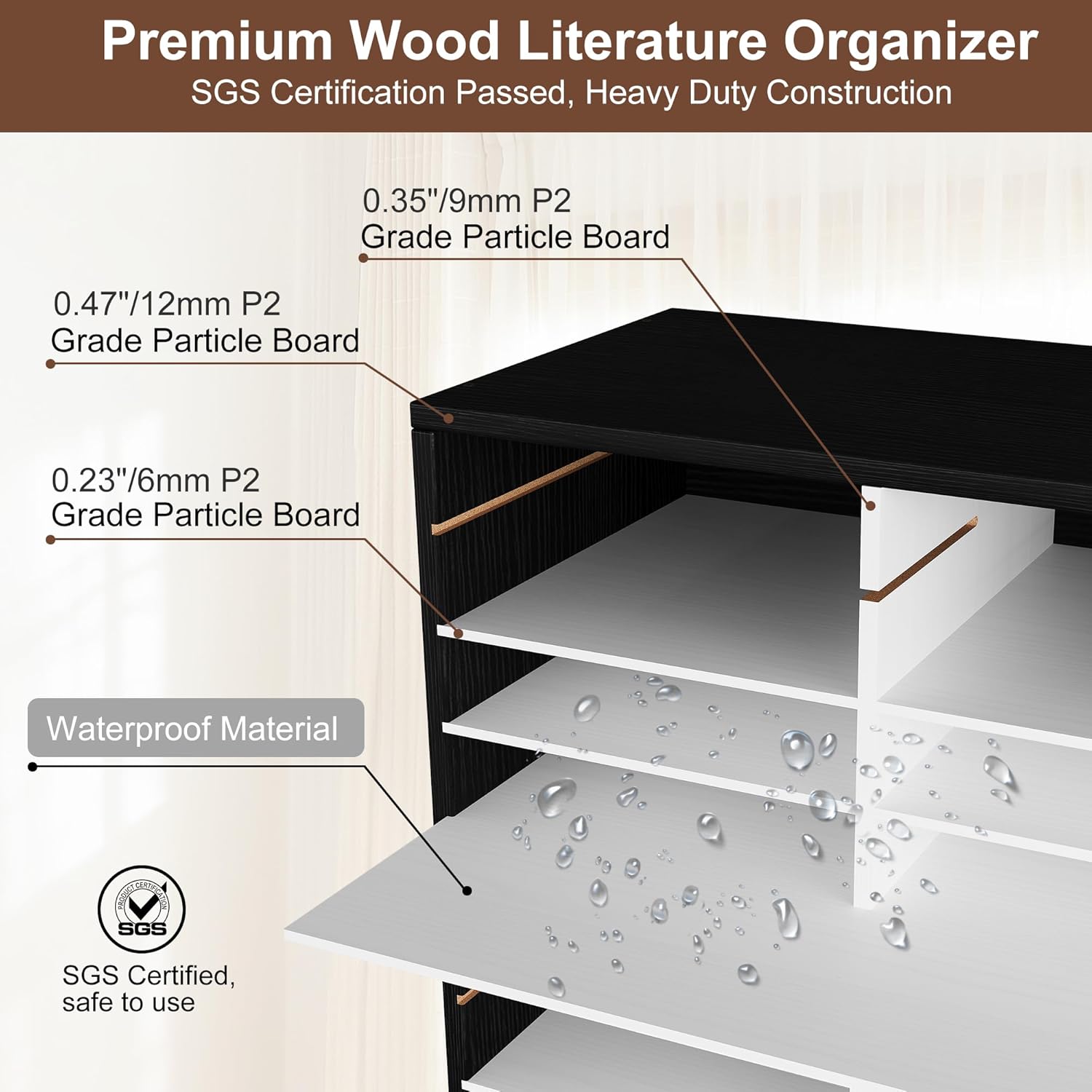 - Wood Literature Organizer with Adjustable Shelves: Crafted from melamine-coated board with EPA-certified, exceptional resistance to deformation, wear-resistant and waterproof reliable mail organizer for desk countertop. Adjust or remove shelves to make space for taller items.