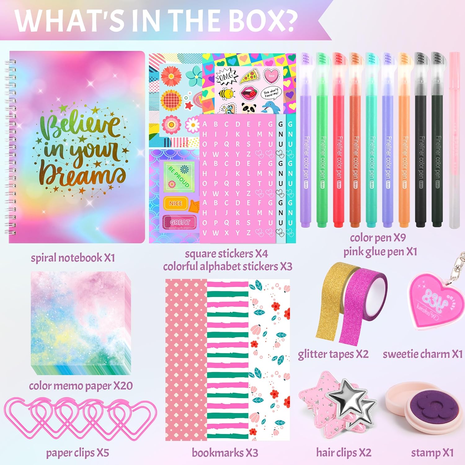- Creative Arts & Crafts Kit: Includes a variety of fun and cute art supplies, such as colorful pens, stickers, and stencils. Itβs perfect for girls who enjoy crafts, journaling, and scrapbooking