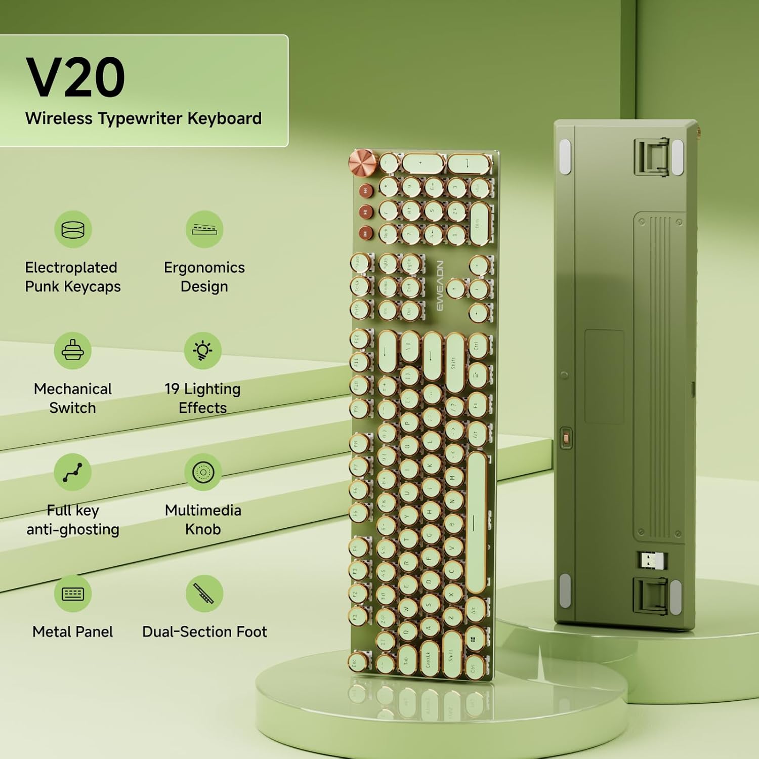 EWEADN V20 Typewriter Keyboard Wireless, 104 Keys Typewriter Style Mechanical with White Backlit, Media Knob, Pink Switch 2.4G/Bluetooth/USB-C Wired Retro Full Size Keyboard for Windows/Mac/PC-Green