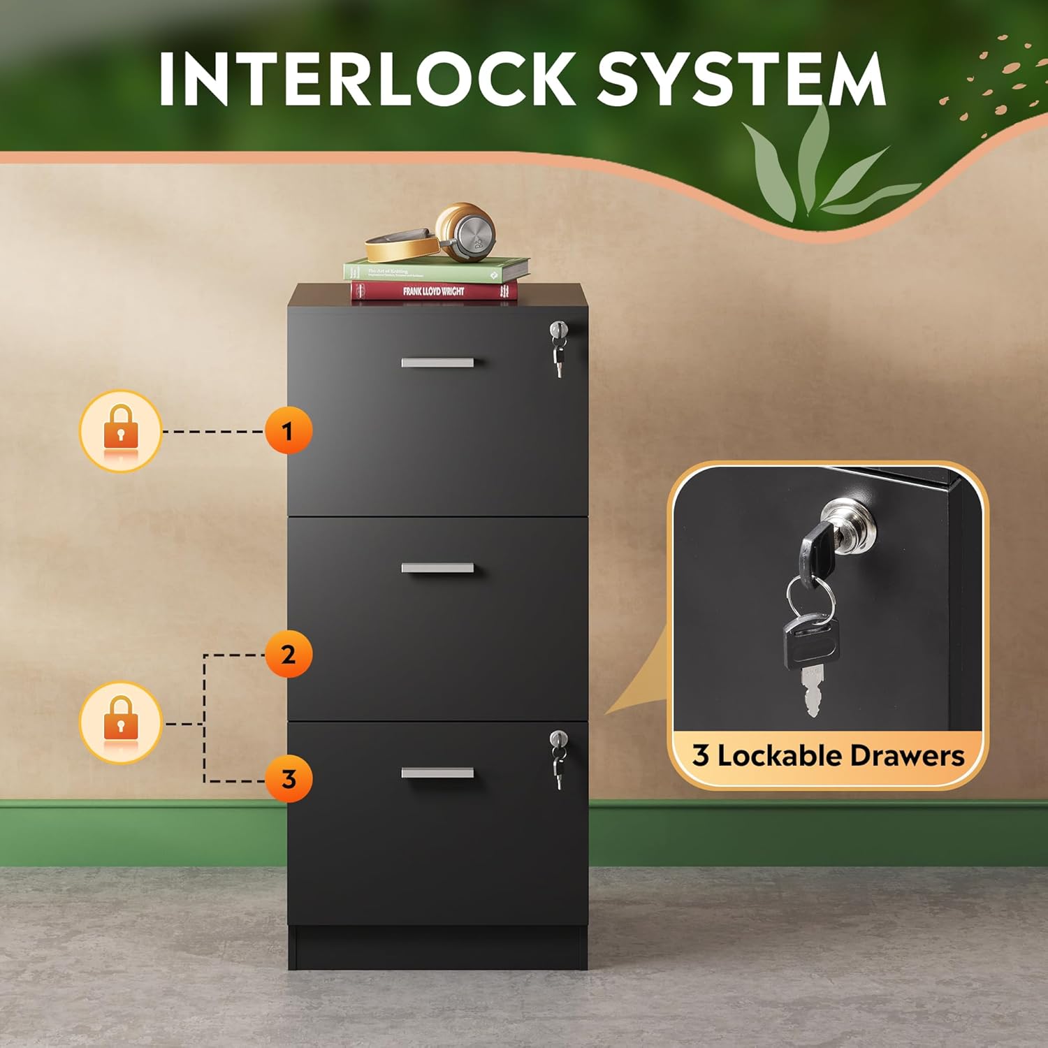 DEVAISE 3 Drawer File Cabinet with Lock, Vertical Wood Filing Cabinet for Home Office, Printer Stand for Letter and A4 Size, Black
