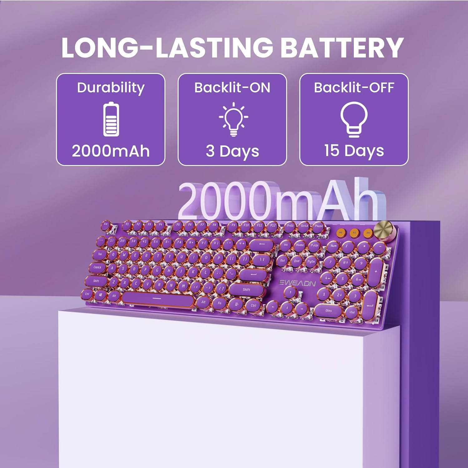 EWEADN V20 Typewriter Keyboard Wireless, 104 Keys Typewriter Style Mechanical with White Backlit, Media Knob, Pink Switch 2.4G/Bluetooth/USB-C Wired Retro Full Size Keyboard for Windows/Mac/PC-Purple