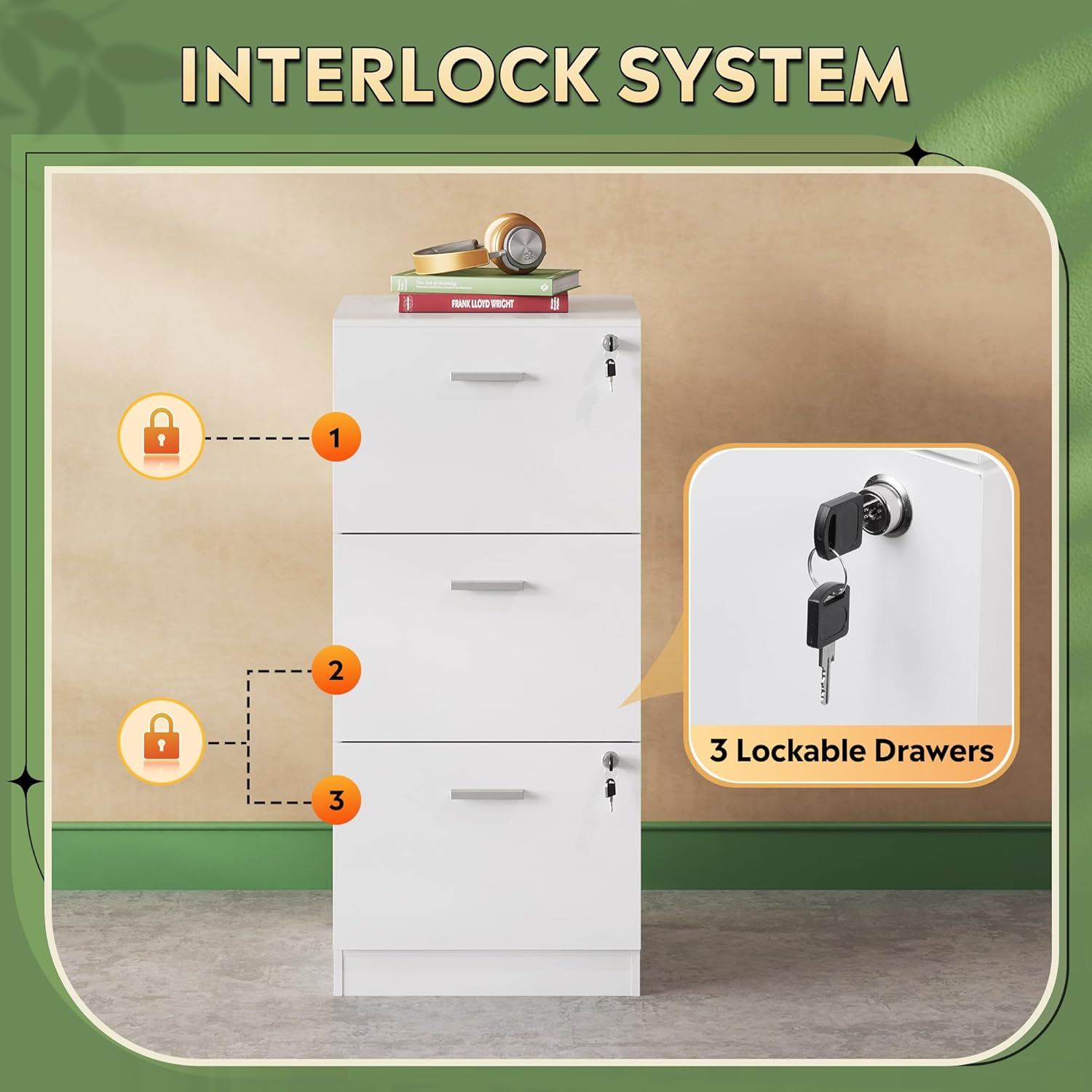- ăLocking Secure StorageăWith a single lock on the top drawer and a double interlocking structure on the bottom, this file cabinet ensures secure locking for all drawers, ideal for storing important documents and personal items, safeguarding your privacy and security.