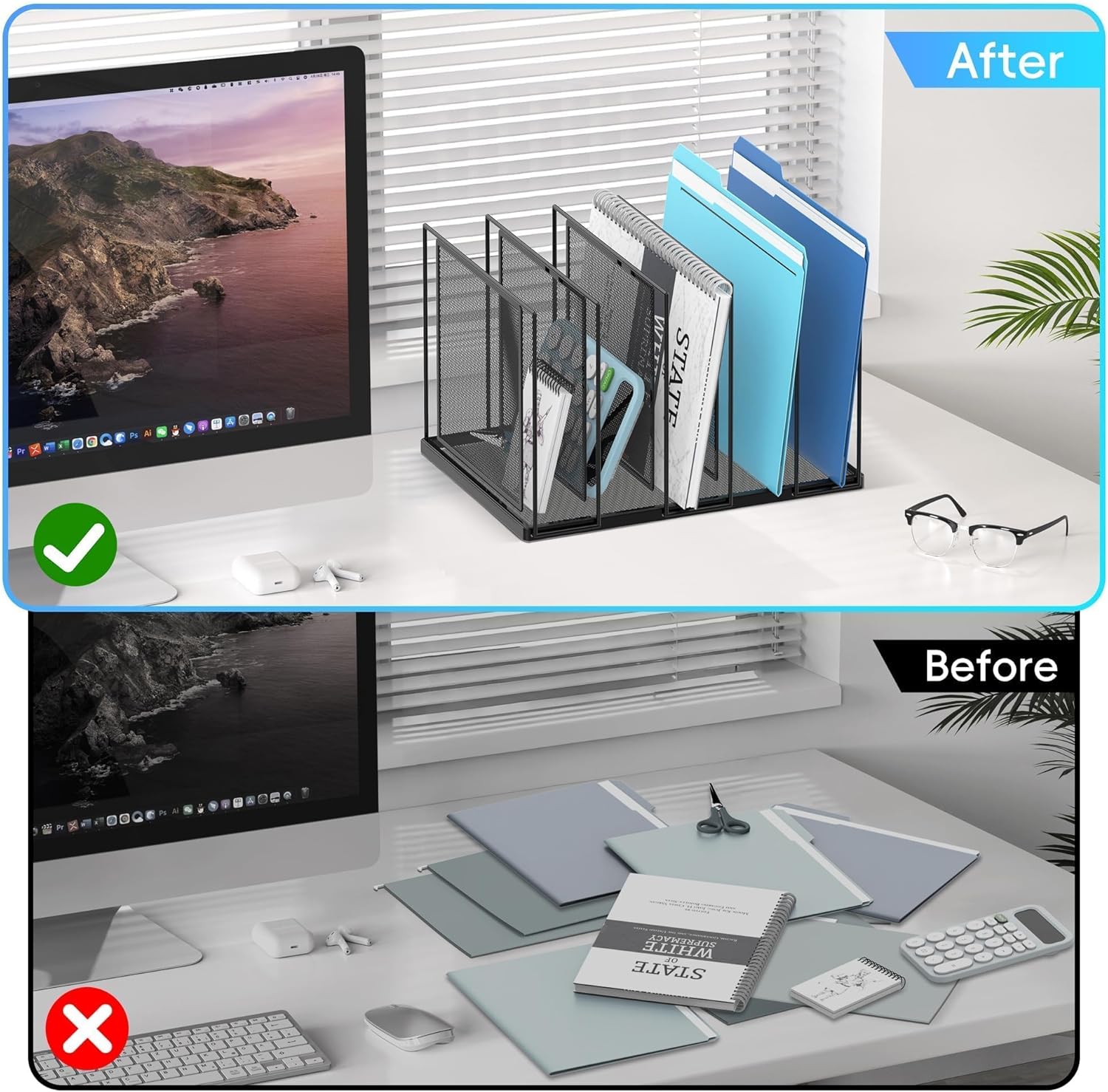- [High Quality & Durability] The sturdy metal frame and durable steel mesh provide support and stability no matter how many items you put on this vertical file holder. The high-quality powder coat helps resist chipping or scratching, protect your desktop while still beautiful.
