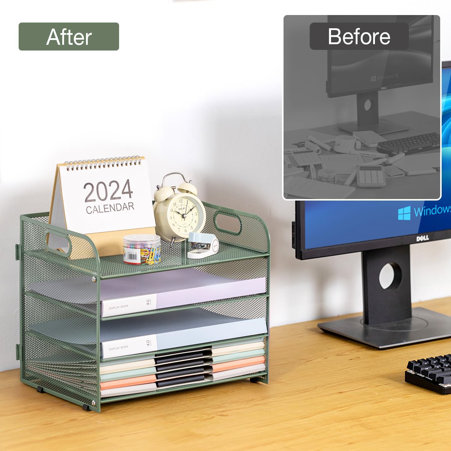 Green Mesh Letter Tray Paper Organizer with Handle - 4-Tier Desk Organizer for Office Supplies