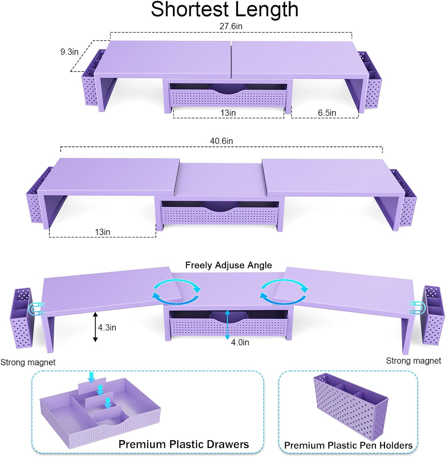- 【Ample Storage Space】The dual monitor stand features two magnetic pen holders and a drawer, allowing you to easily organize your desk accessories and office supplies, keeping your workspace clear and tidy for easier access.