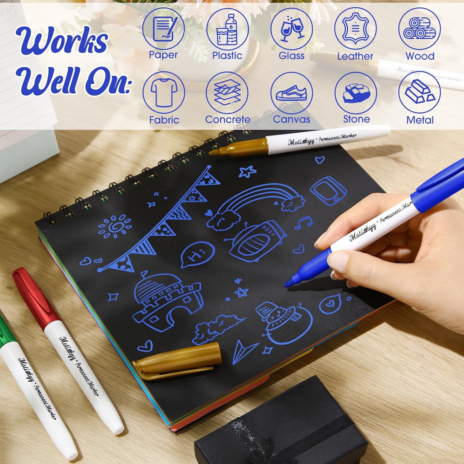 - Marks on Most Surfaces: Versatile metallic marker pens can create on a variety of dark and light surfaces, such as paper, wood, enamel, black paper, sketch paper, canvas, wood, brick, stone, glass, mirror, window, metal, plastic, ceramic, fabric and other crafts