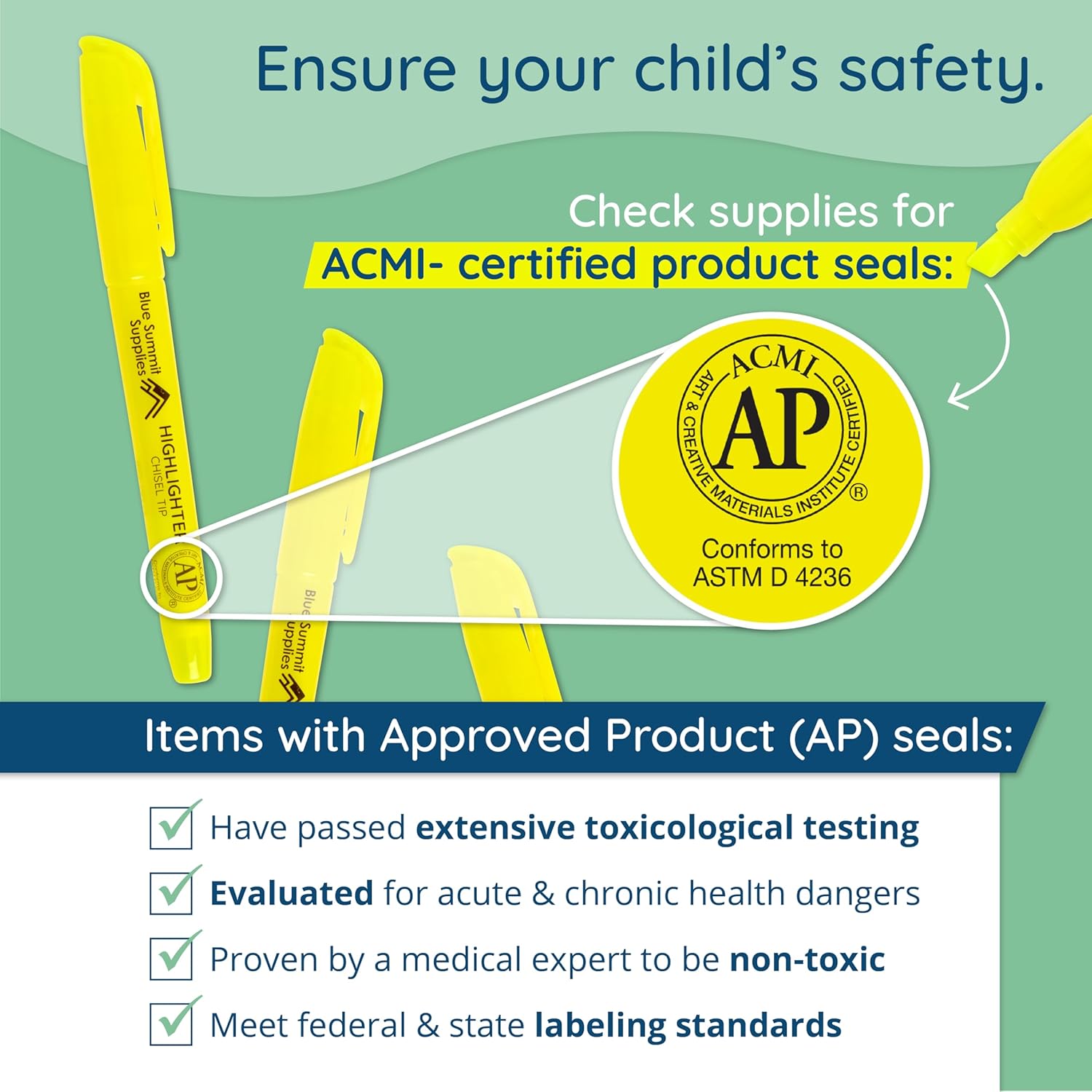 - Safe for All Ages β Each yellow highlighter is an ACMI-Certified Approved Product (AP) and non-toxic, making it safe for use by children, students, teachers, or professionals in classrooms, homes, or offices.