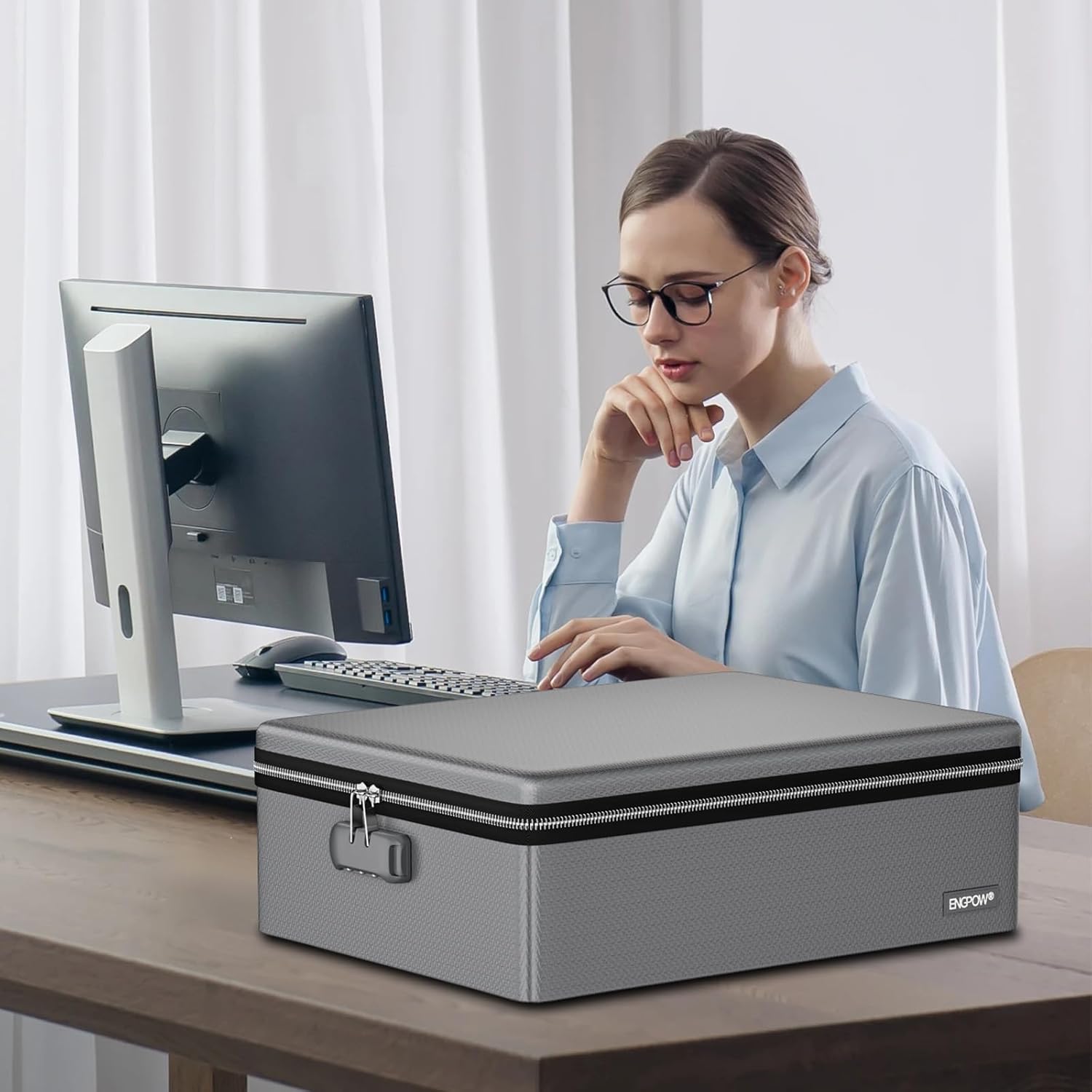 ENGPOW Fireproof Document Box, Hard Case File Box with Fireproof Zipper&Lock, 6400°F Heat Insulated Fire and Water Resistant File Organizer Storage Safe for Important Documents Laptop Cash, Gray
