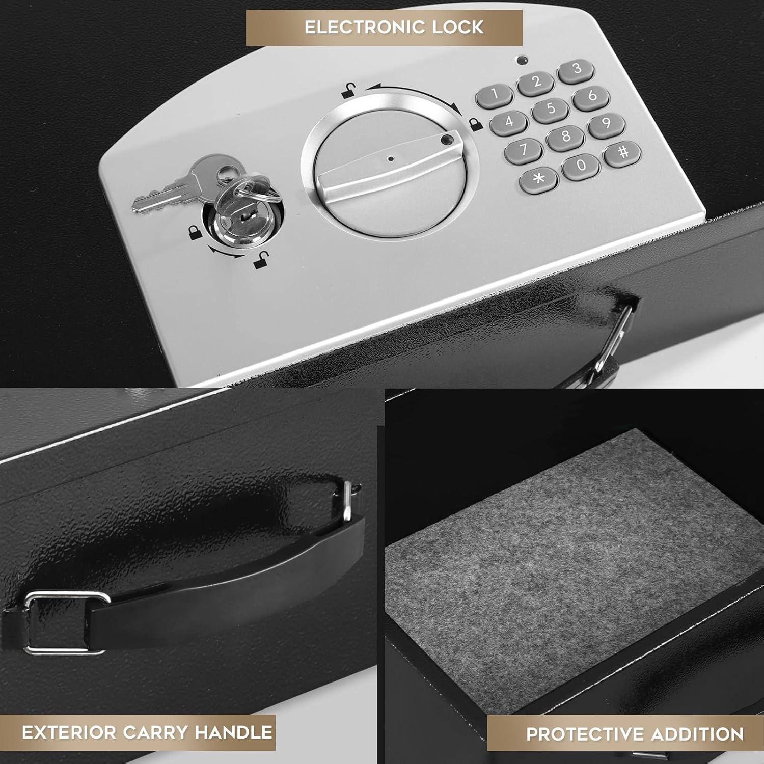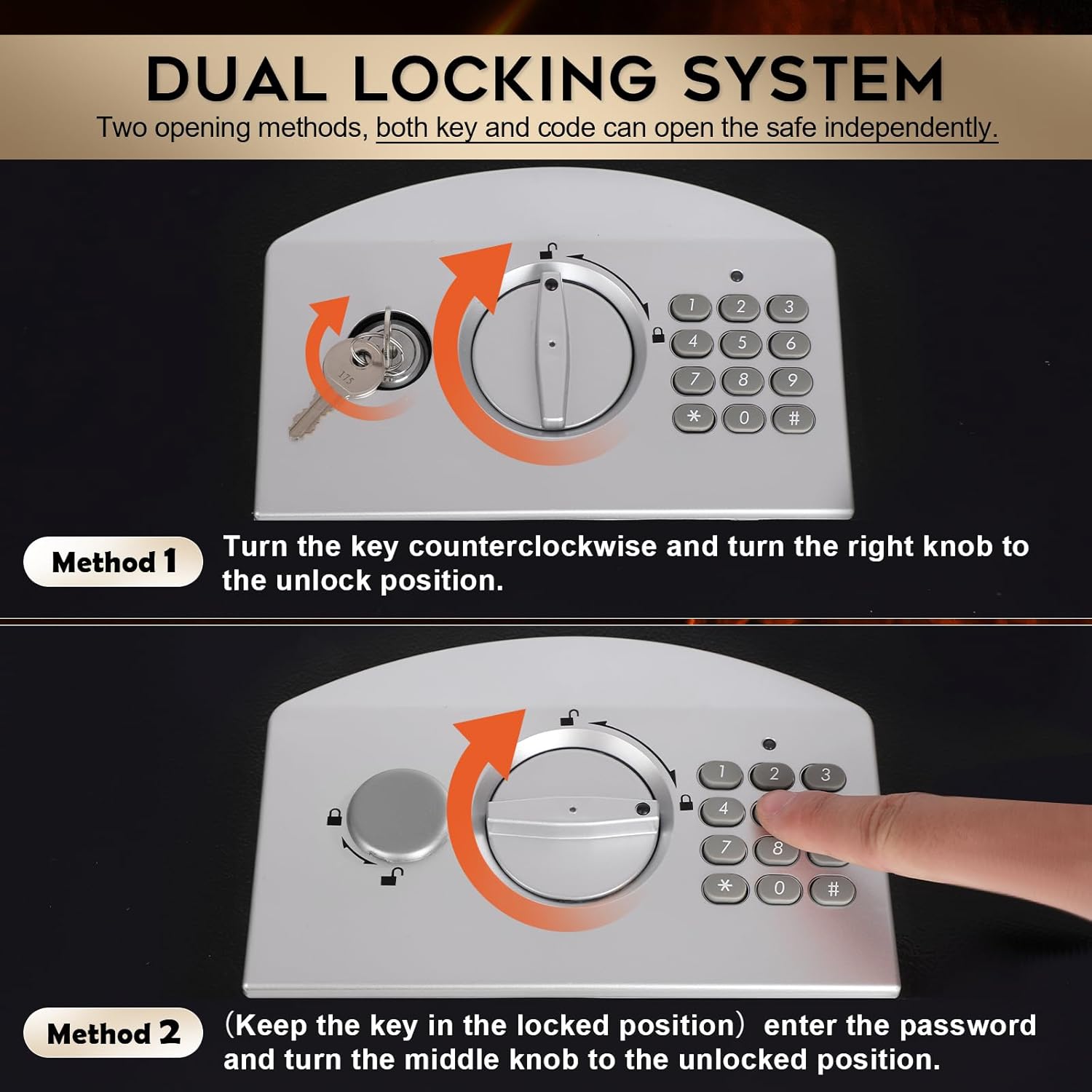 • 【HIGH SECURITY】The electronic lock is equipped with a keypad for easy access and includes 2 backup keys in case of power outages. Protect your valuables with a fire-resistant digital code lock safe. Your assets will be safe from fire and theft.(ATTENTION:Need to prepare four AA batteries by yourself)