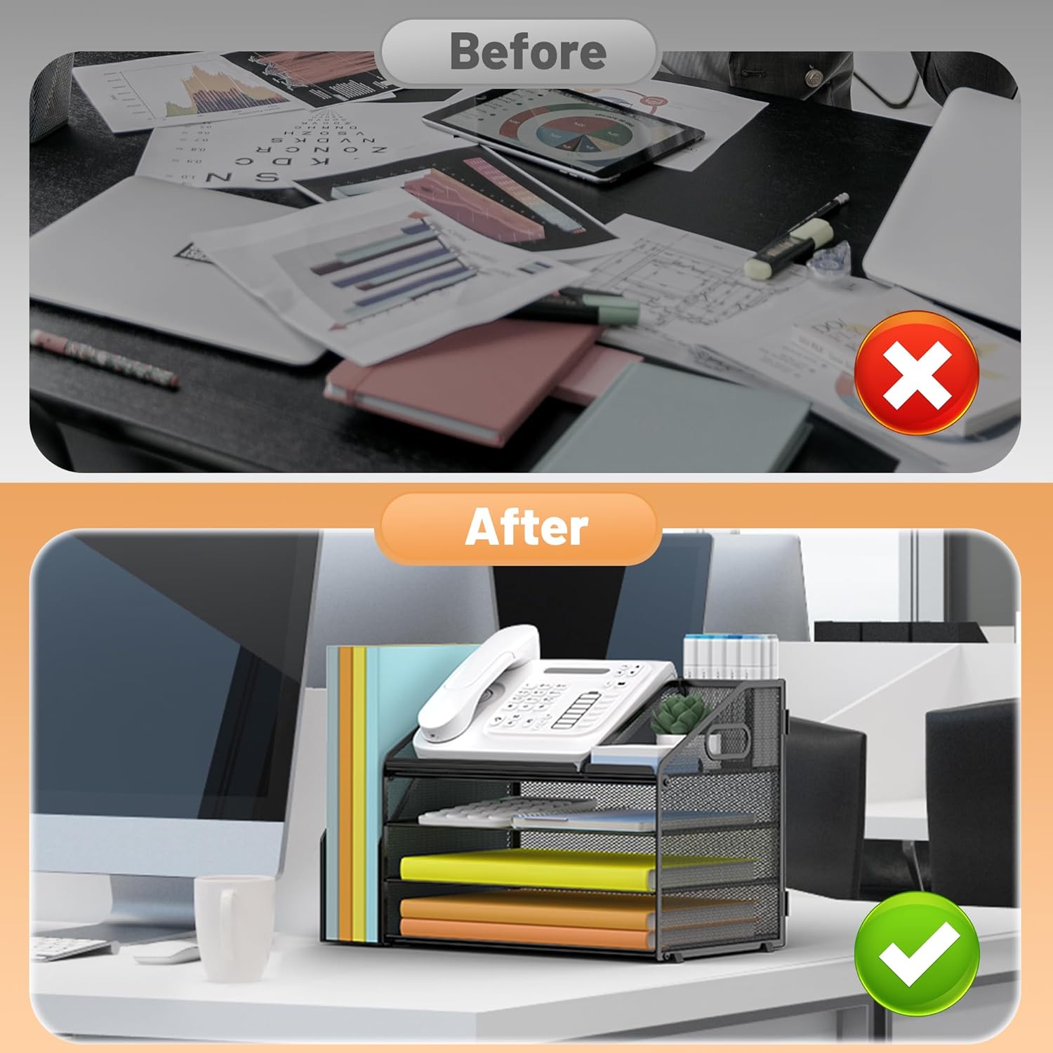 - 4 Tier Organization with Pen Holder: This desk organizer boasts a 4 tier design for efficient sorting of your papers, letters, and other office supplies, along with a dedicated pen holder. It's perfect for maintaining a tidy and uncluttered workspace. The desk file organizer is an essential desk accessory that contributes to an orderly and professional atmosphere