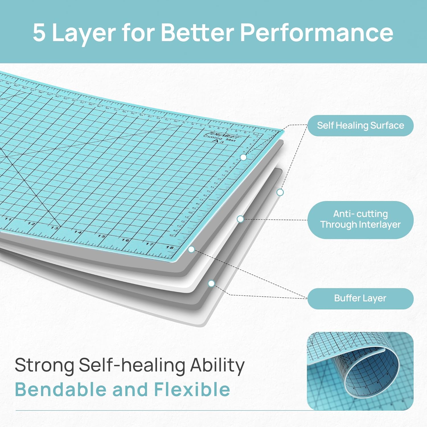 Full 18''x12'' Grid Size Self Healing Cutting Mat, A3 Rotary Cutting Sewing Mat, 5-Ply Double Sided Cutting Board for Crafts Sewing Quilting Hobby Fabric Precision Scrapbooking Project, Aqua Blue