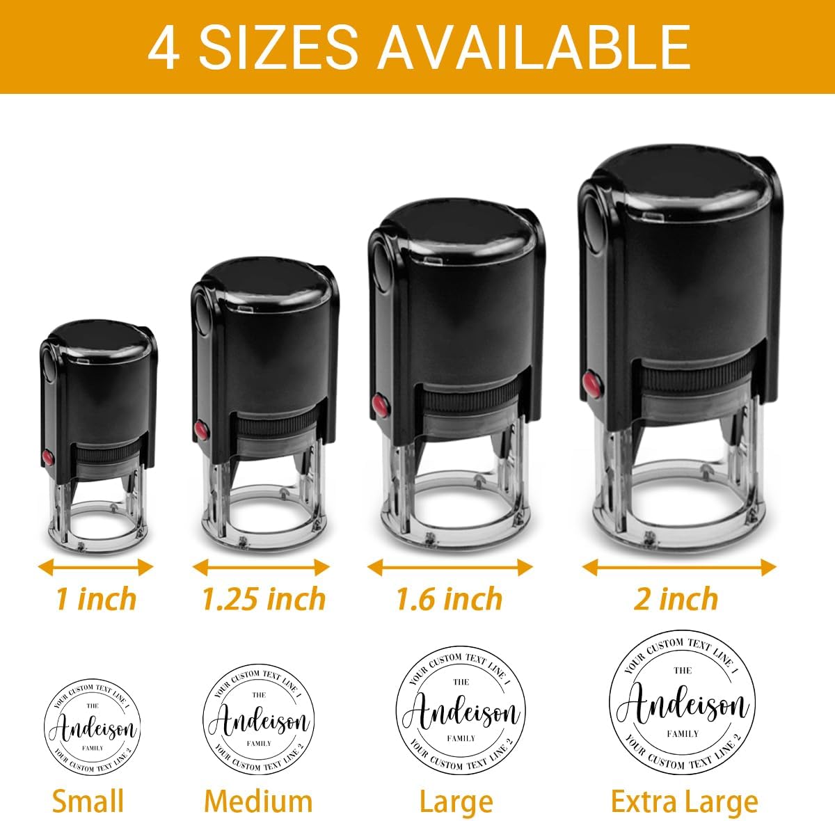 - 4 Size Options for Any Need - Our custom rubber stamps come in four sizes to suit any purpose: Small (1 inch), Medium (1.25 inches), Large (1.6 inches), and Extra Large (2 inches). Each size offers legible, easy-to-read impressions that are perfect for wedding stationery, business packages, greeting cards, gift tags, and more.