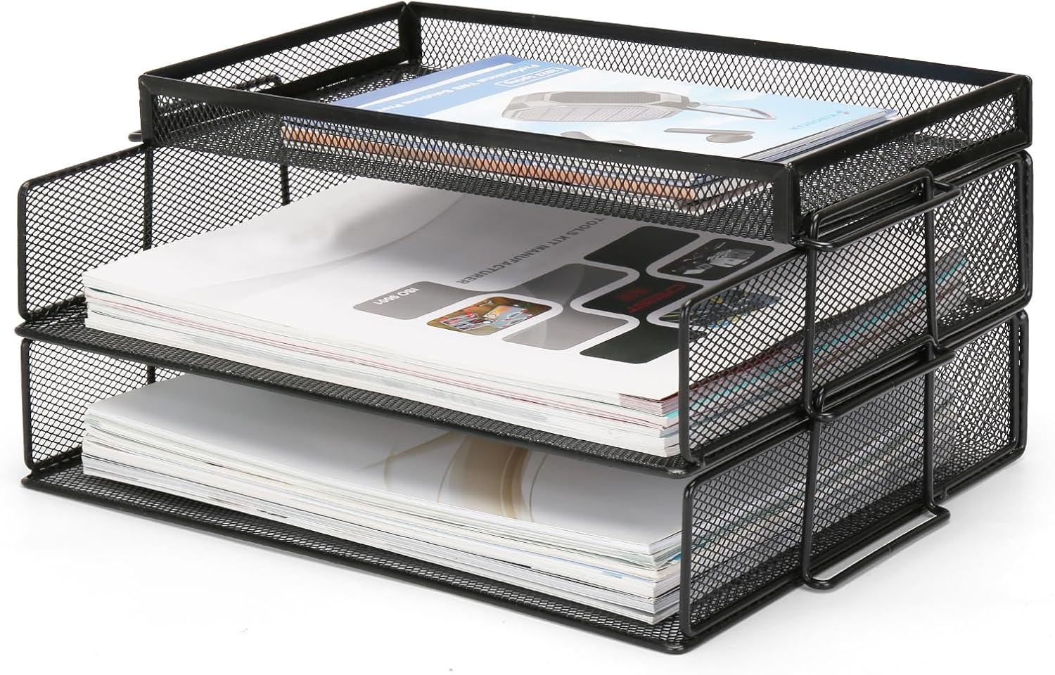 Office Drawer Organizer, 2 Tiers Stackable Paper Tray Organizer for Desk, Standing Papers File, Black Mesh/Office File Collation