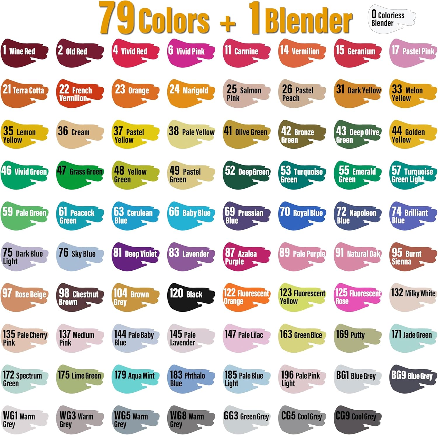 - 80 VIBRANT COLORS:This set includes 79 vibrant colors, offering everything from soft shades to bold, rich hues. We've also included 1 colorless blender marker to help with seamless blending and layering without leaving streaks. Whether you're blending, shading, or adding intricate details, these markers will inspire your creativity with a full spectrum of colors to bring your artwork to life.