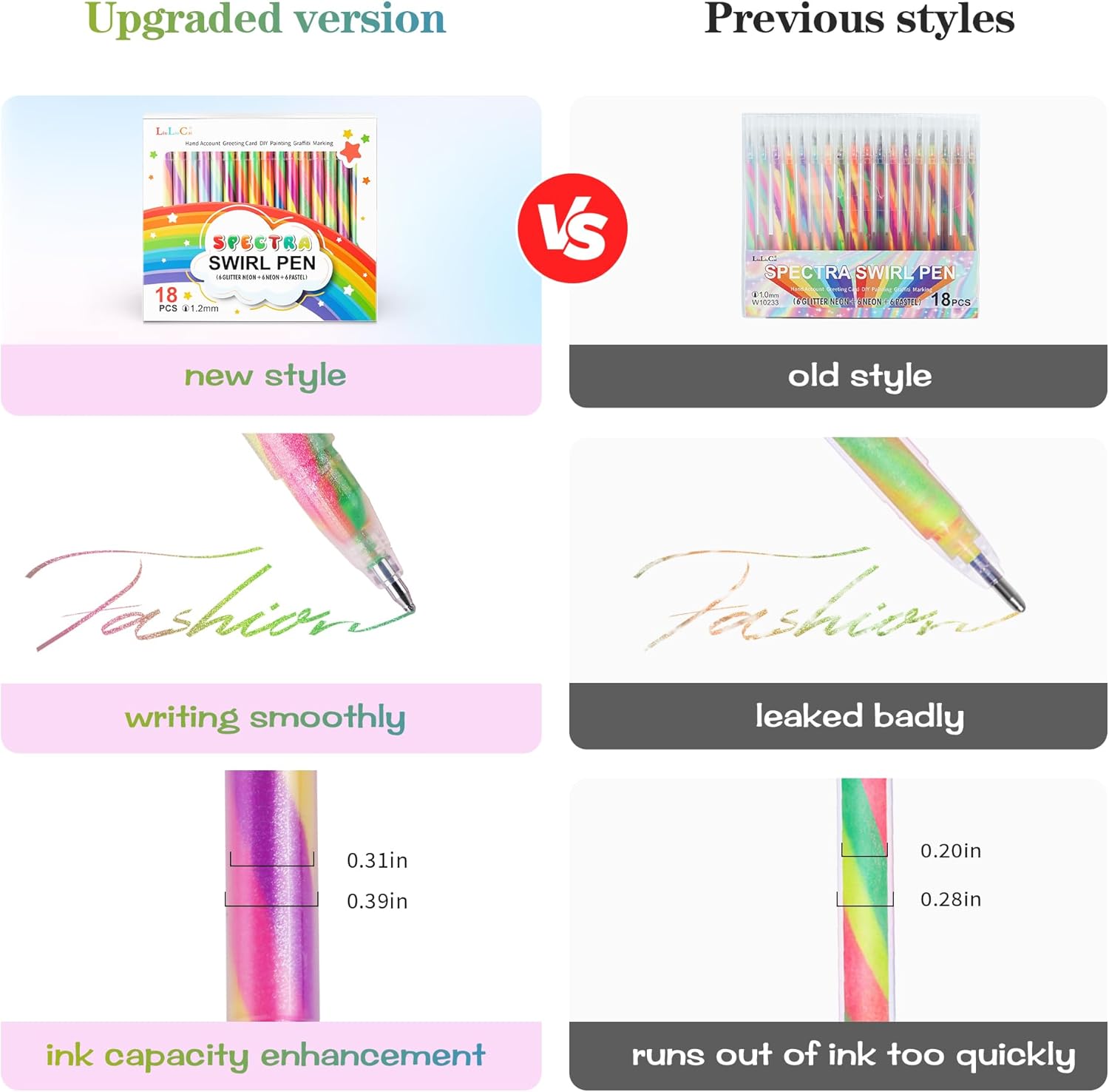 - 【Magical 3-Color Mixing with Stable Chroma】18 unique pens combine Glitter (6), Neon (6), and Pastel (6) formulas to create seamless gradients. Each pen contains triple-color ink blends for dynamic transitions with every stroke. New! Enhanced color stability prevents uneven fading or streaking, ensuring vivid rainbow effects on both light & dark papers