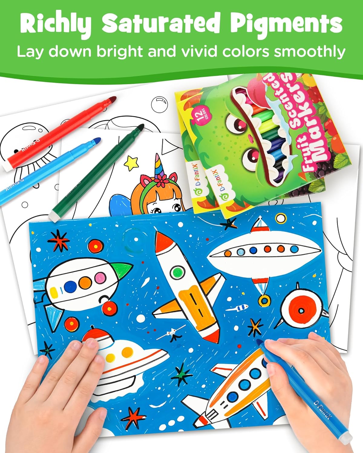 - 4 Irresistibly Fruity Scents: Each colored marker bursts with real fruit aromas: sweet strawberry, crisp apple, juicy blueberry, and tropical banana. The delightful scents add a sensory twist to coloring, making art time more engaging and fun. Turning every drawing into a multisensory adventure that fuels creativity and curiosity
