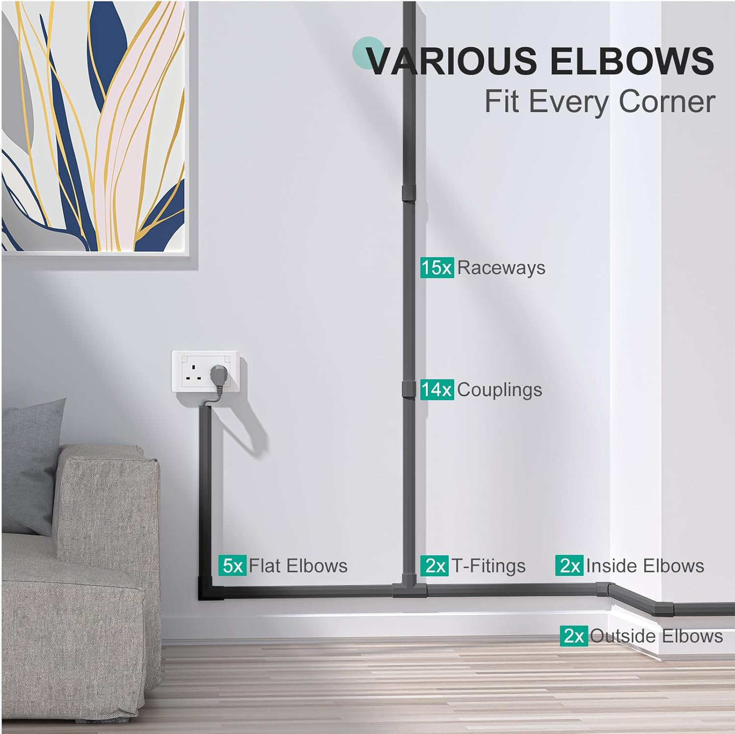 - 15 Pcs Black Cord Hider Kit: Our cable hider wall includes 15Ă—plastic cable raceways channels (each channel is L16.9inĂ—W1.18inĂ—H0.6in, 254 inches total in length), 14Ă—Couplings, 5Ă—Flat Elbows, 2Ă—T-connectors, 2Ă— Inside Elbows, 2Ă— Outside Elbows, 32Ă—screws, 32Ă—wall anchors, 2Ă—rolls of double-sided tape and an installation guide, 254" cord covers for cords on wall enough for just about any job